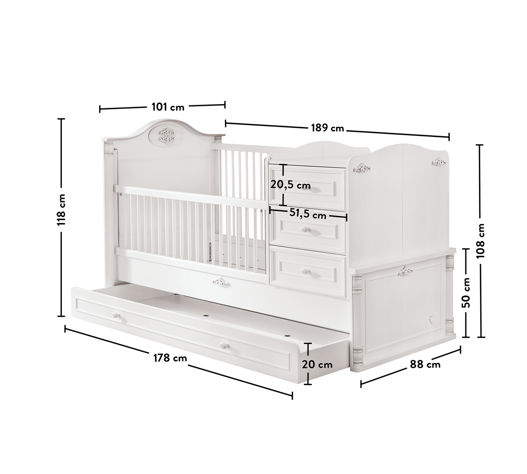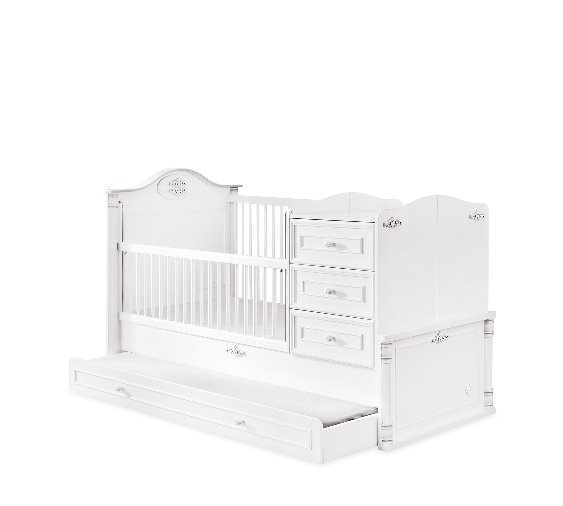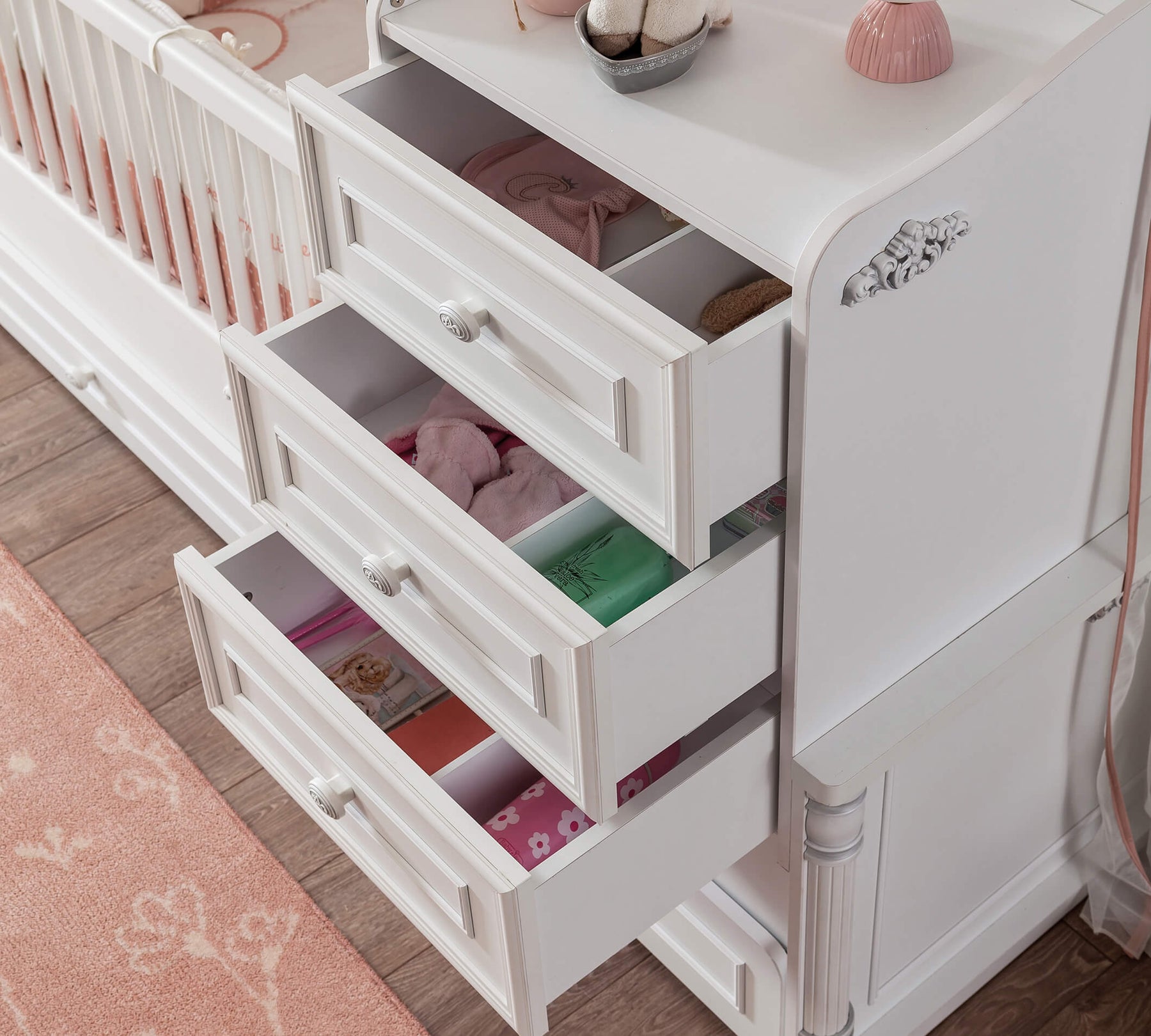 سرير Romantic القابل للتكبير للأطفال الصغار يقدم تصميمًا مدمجًا يوفر استخدامًا طويل الأمد بفضل تصميمه العملي. يتألف السرير من أجزاء متعددة الوظائف، حيث يمكن استخدام الأدراج وأرفف التخزين لتغيير الحفاضات في مرحلة الطفولة، ثم فصلها لاستخدامها كطاولة جانبية عند كبر الطفل.