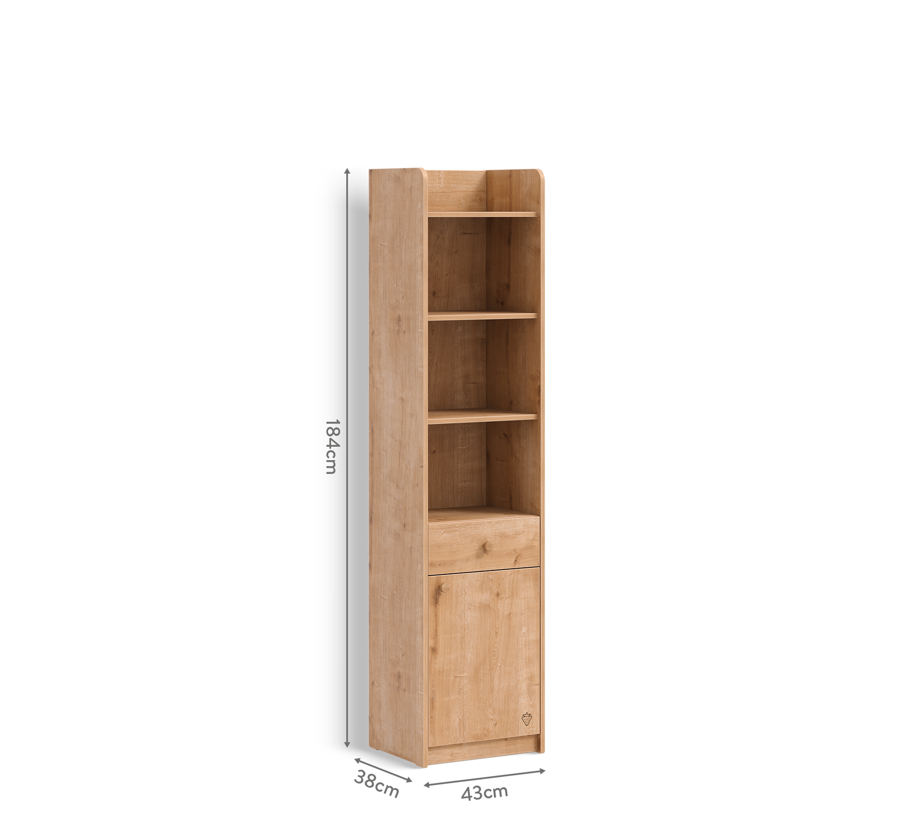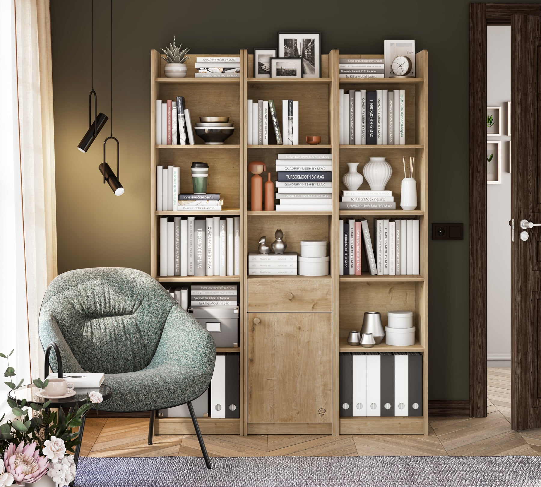 بفضل هيكله الطويل الضيق، يمكن استخدام رف الكتب مع الدرج موكا بسهولة حتى في المساحات الصغيرة، حيث يمكن وضع الكتب من جميع الأحجام بكل راحة بفضل الأرفف ذات القياسات الواسعة.
