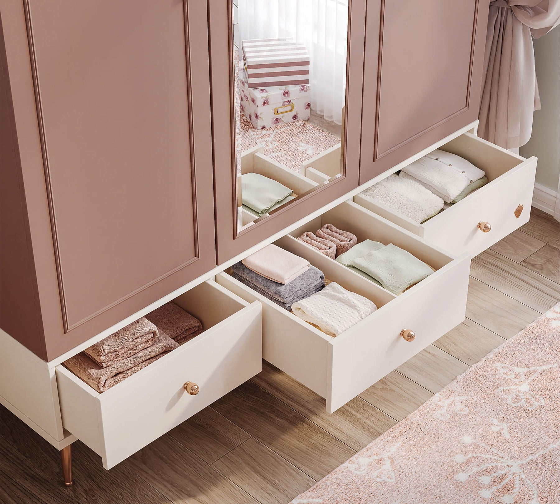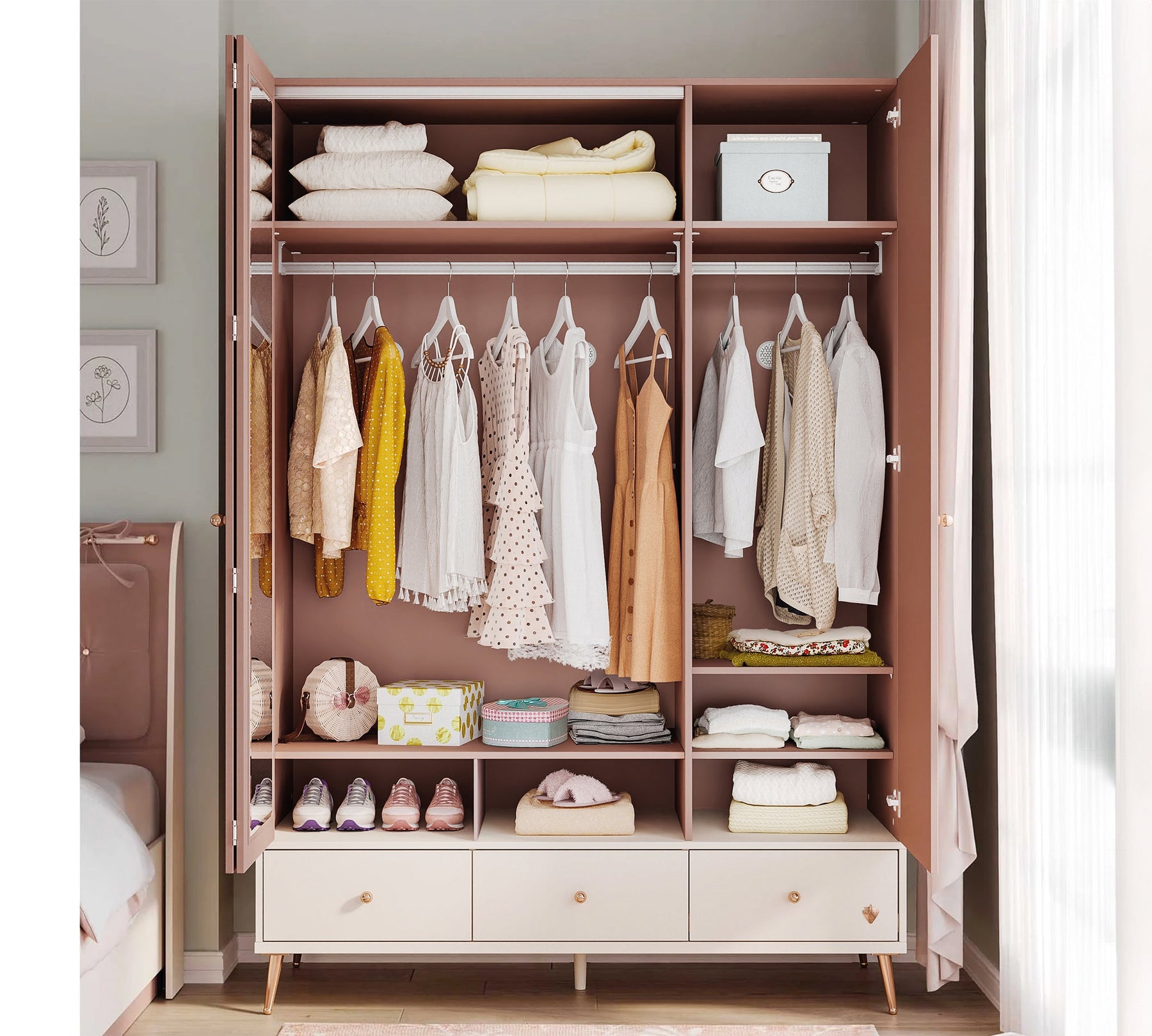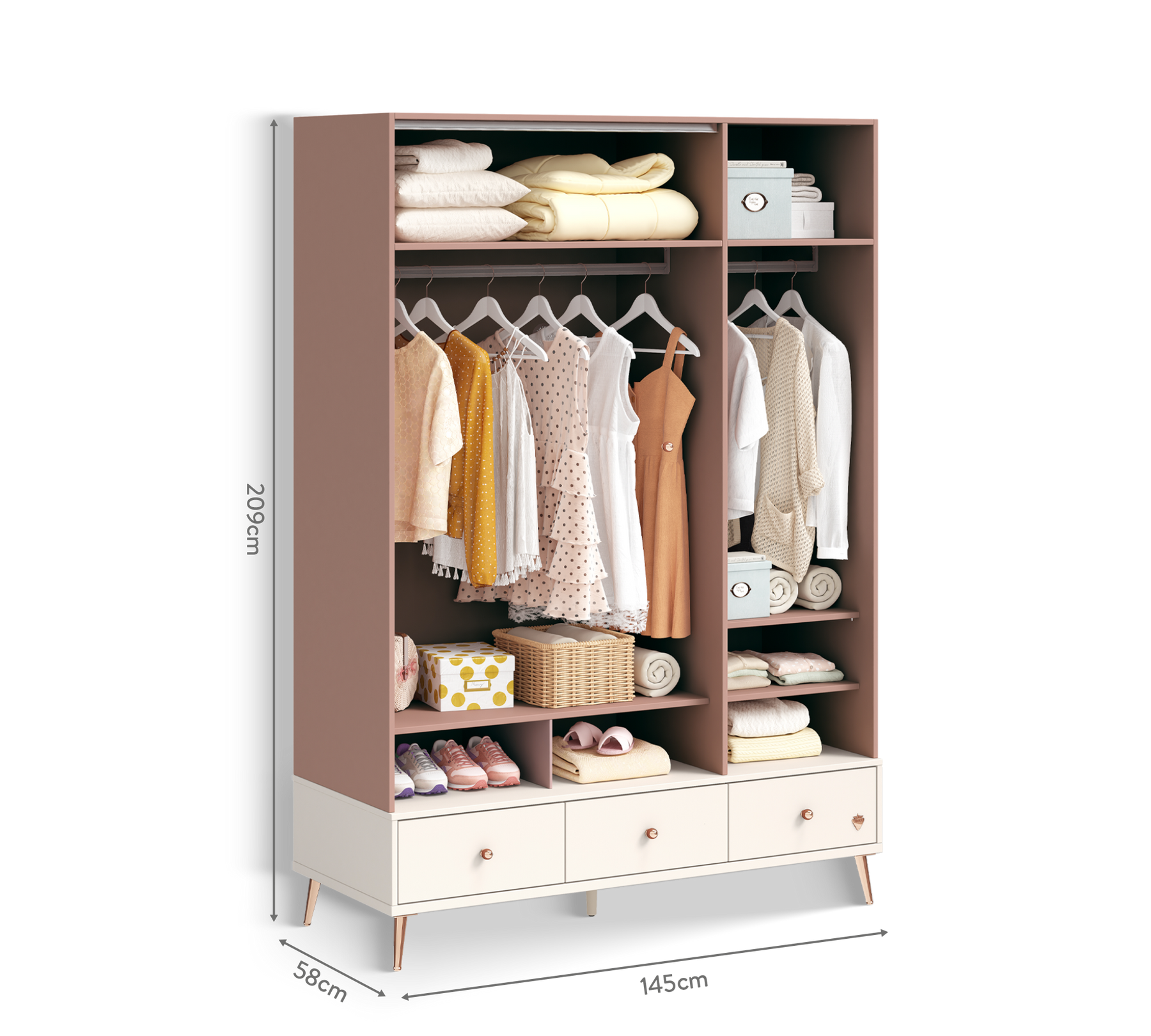 تحتوي الخزانة على العديد من الأرفف التي تلبي احتياجاتك من الملابس. توفر الأدراج الثلاثة تنظيمًا فعالًا، حيث يسهل التصميم المجزأ في الدرج الأوسط ترتيب الأشياء الصغيرة، بينما تُستخدم الأدراج الأخرى لتخزين العناصر الأكبر.