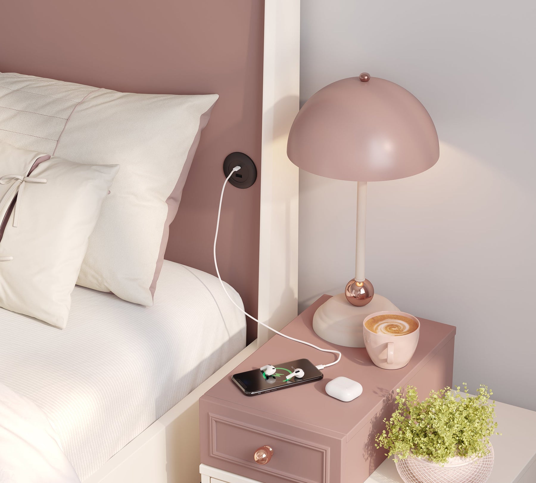 يضيف استخدام تطبيق السقف الناعم في قسم الرأس تعبيرًا لطيفًا للسرير، مما يكمل جو الغرفة الرقيق والأنيق الذي تحلم به الفتيات. تمثل أناقة لون روزيت في المقدمة تناغمًا جميلاً مع درجات لون فزان كريم المستخدمة في الجسم والقدم.