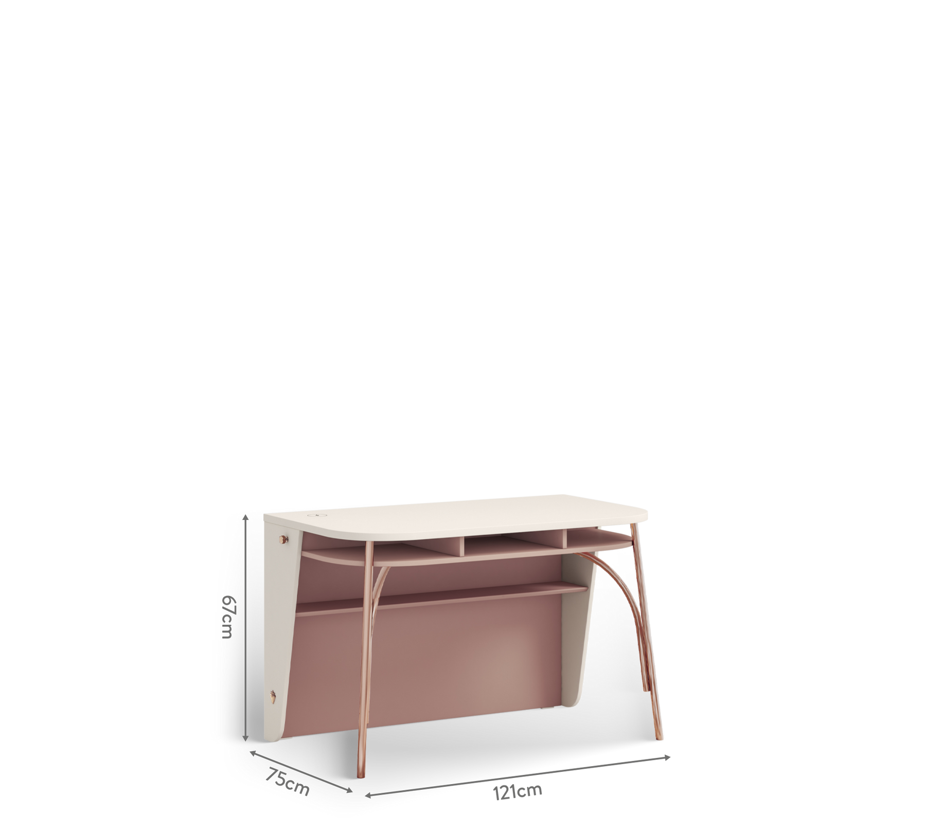 Thanks to the color harmony of Rosette and Cream Mink, it offers an aesthetic appearance while adding an elegant touch to the environment with its rose gold plated metal legs. Its ergonomic dimensions provide the user with a comfortable and efficient working experience.