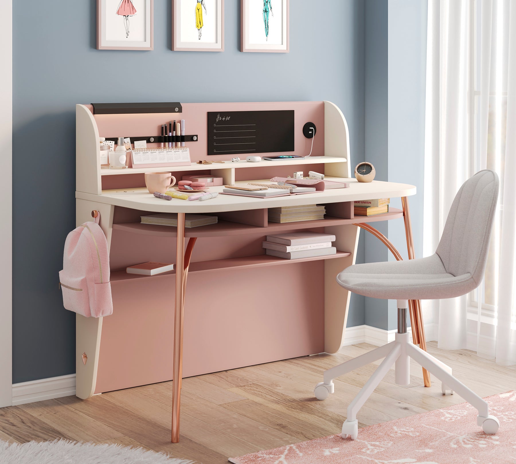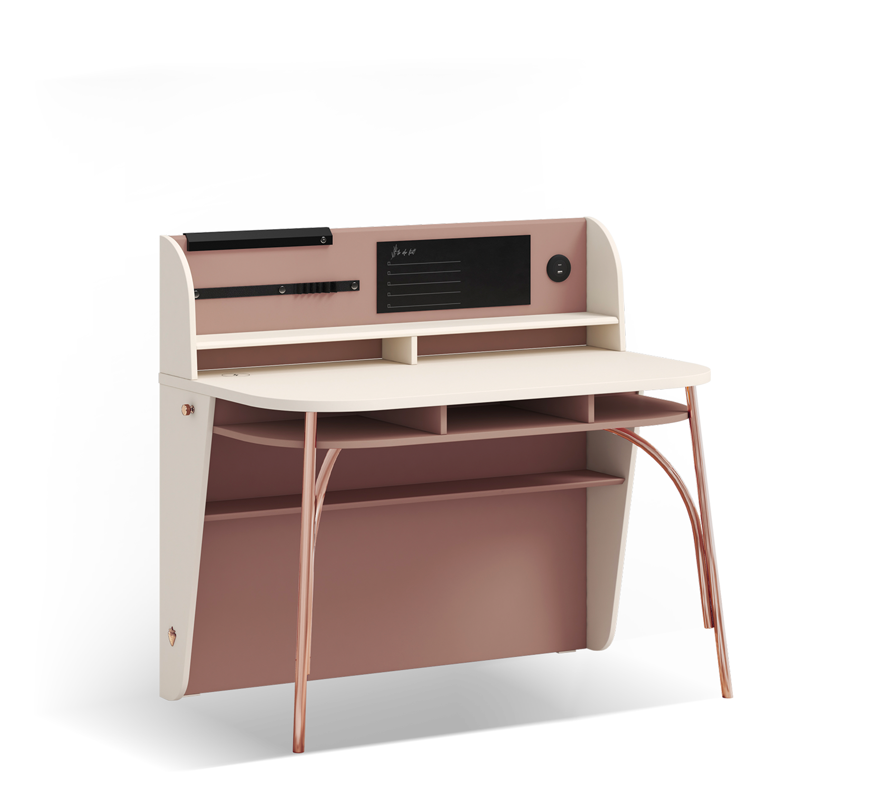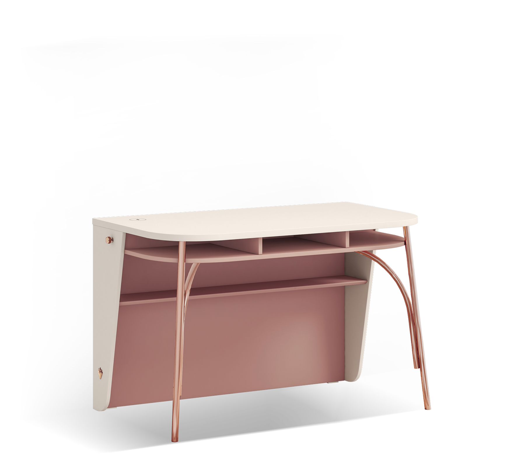 توفر مظهرًا جماليًا بفضل تنسيق لون الروزيت والكريم البيج، بينما تضيف أرجلها المعدنية المطلية بالذهب الوردي لمسة أنيقة للبيئة المحيطة. بفضل أبعادها المريحة، توفر تجربة عمل مريحة وفعالة للمستخدم.