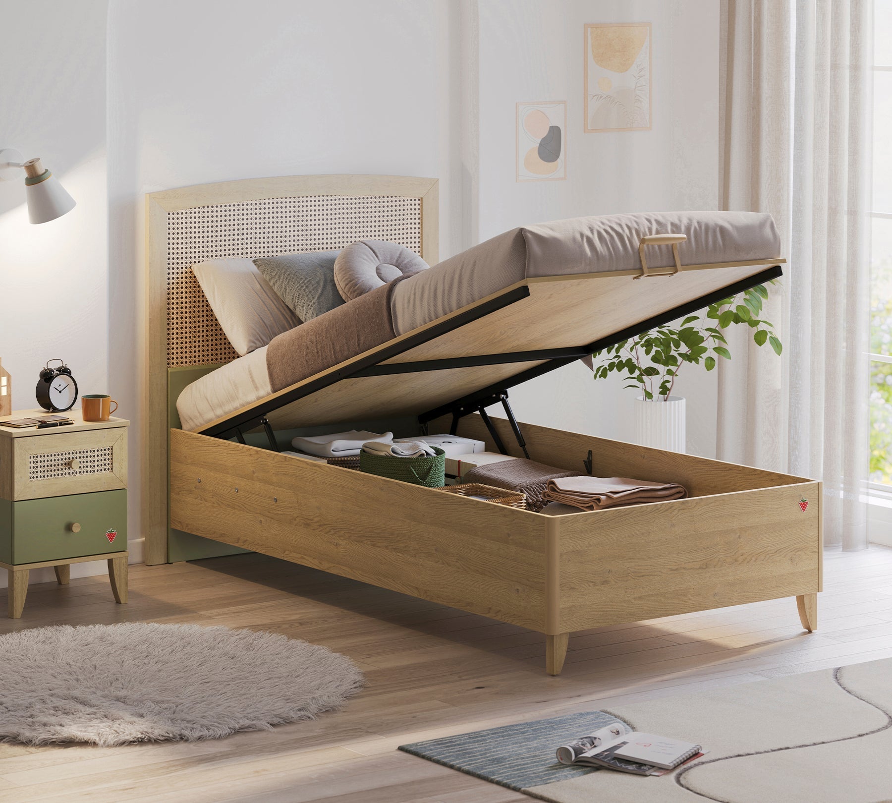 The storage space beneath the base offers an ideal solution for organizing and storing your belongings. The base bottom panels are provided in two parts for user convenience, and safety locks are designed with user safety as a priority. It is recommended to use the locks in the secured position while opening the base and to release them when closing. All edges in contact during use are protected with special edge bands for added safety.