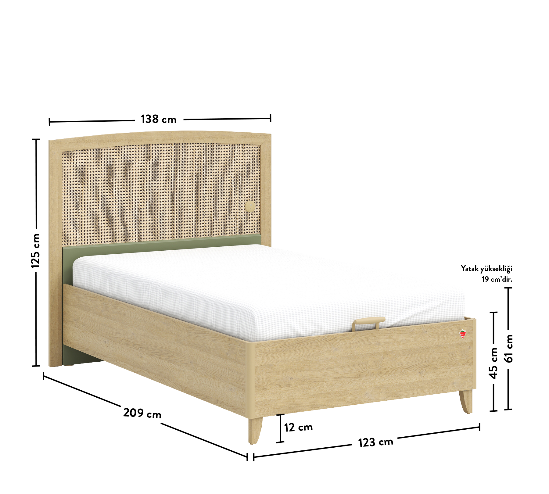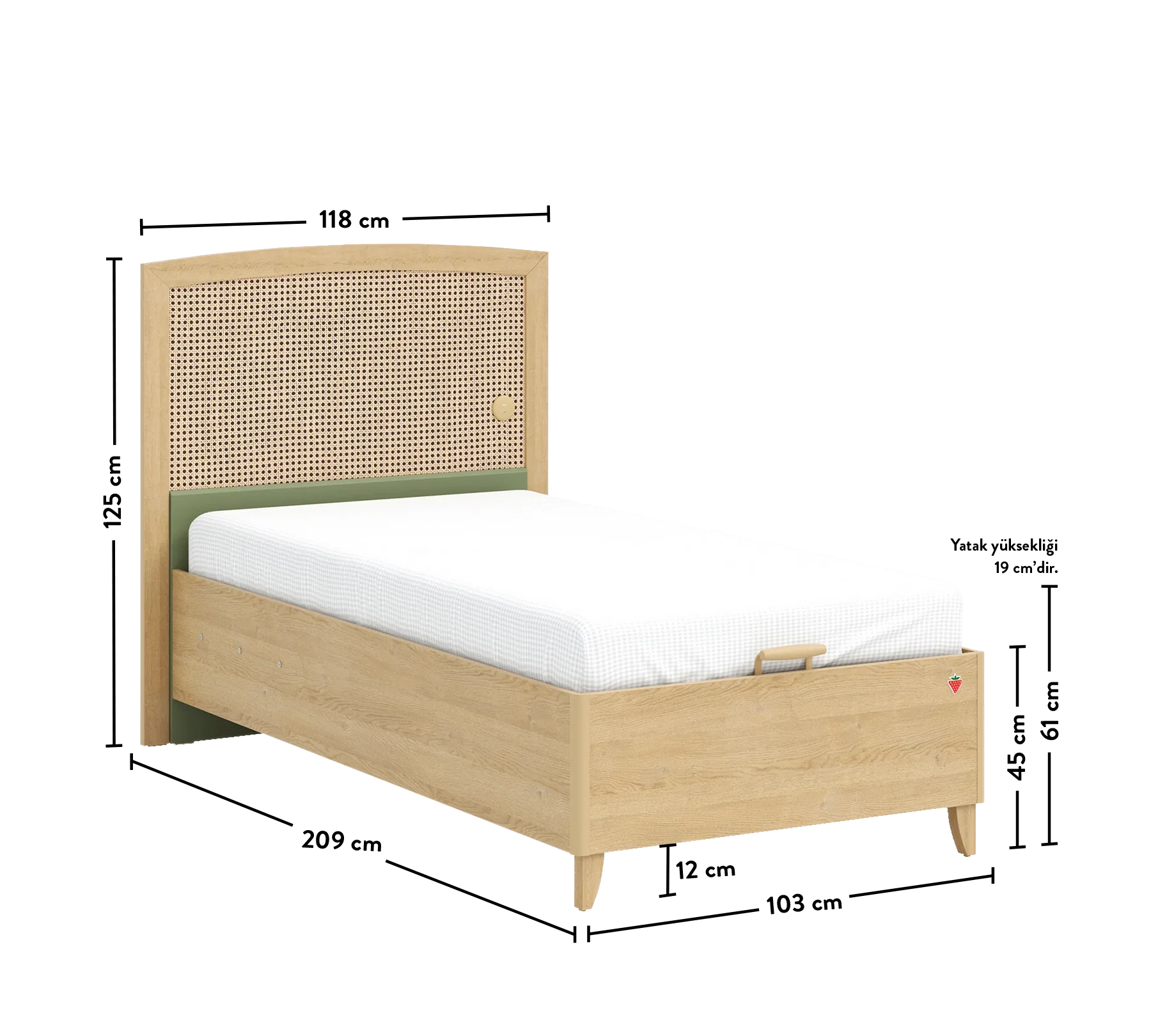The Loof Bed with Base 100x200 cm, where modern design meets comfort and functionality, adds a touch of elegance to your bedroom. The soft detail applied to the upper edge of the half-height backrest enhances relaxation while maintaining an aesthetic appeal. Handles and legs crafted from wood ensure design consistency.