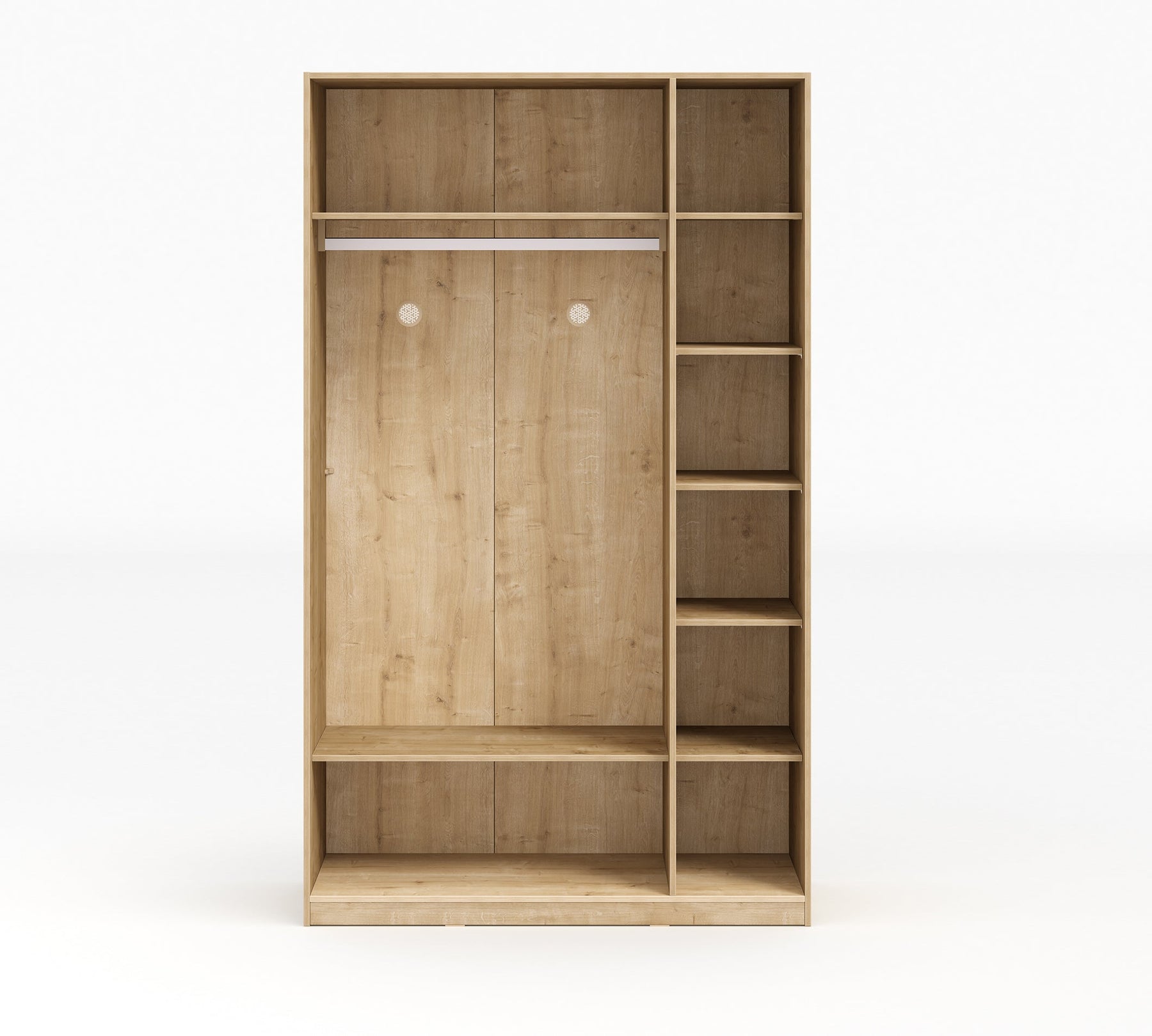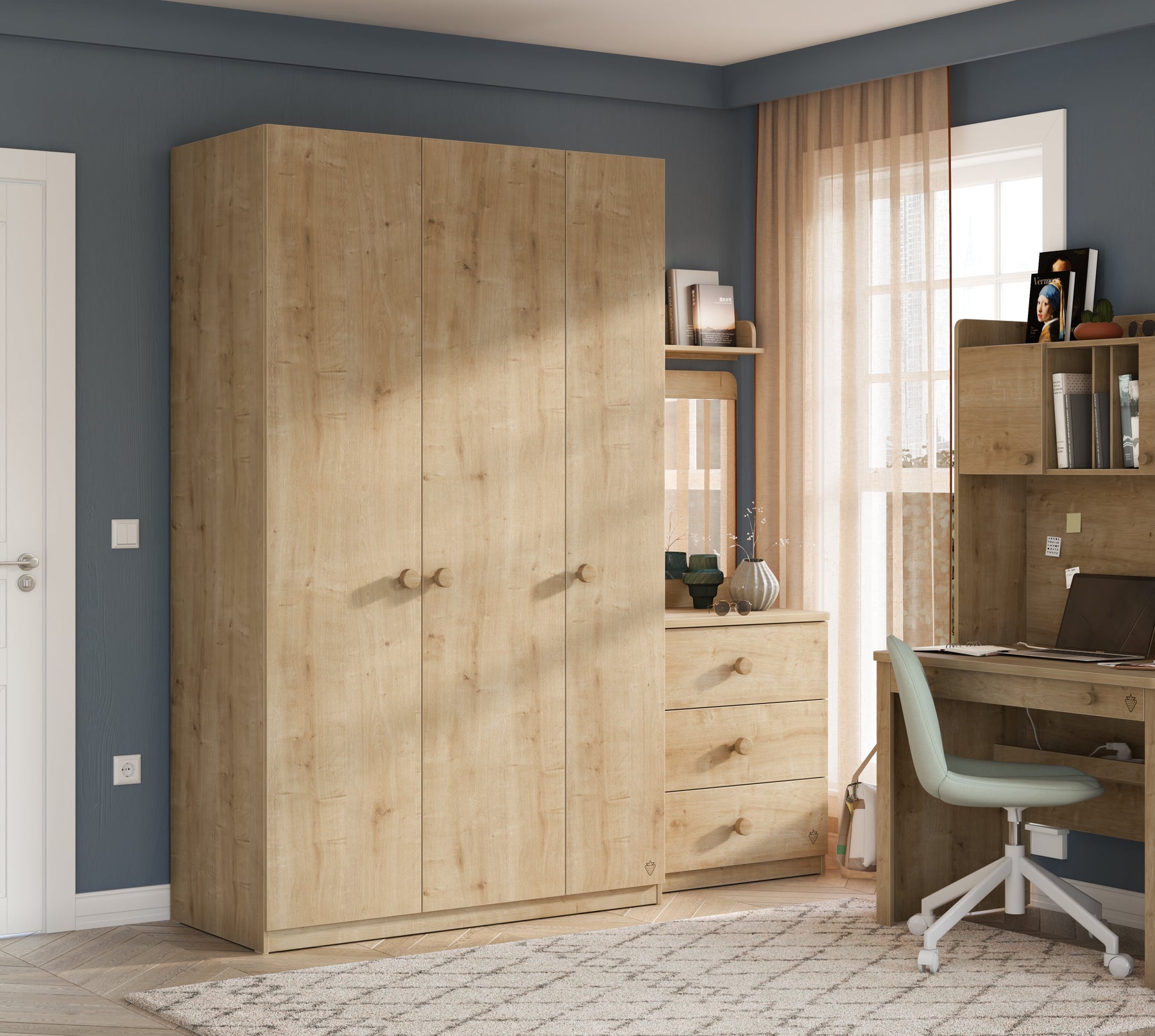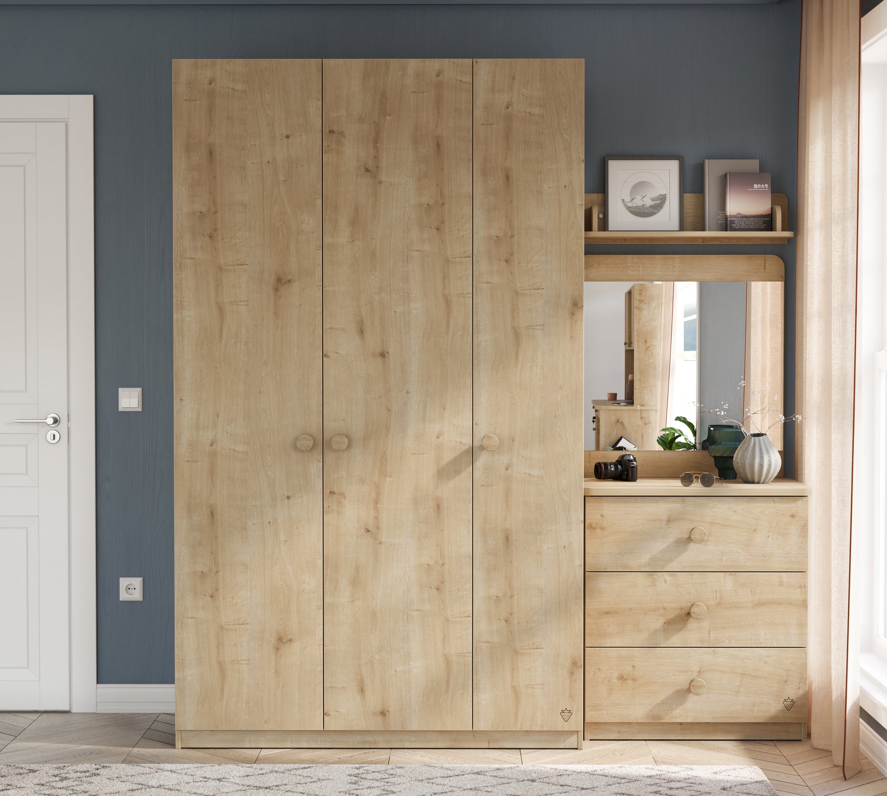مع العديد من الأرفف وحجمها الداخلي الواسع، توفر لك المزيد من الوظائف خزانة موكا ذات الثلاثة أبواب، حيث تقدم نظام مفصلات مع مهدئ في الأبواب مما يضمن استخدامًا صامتًا وآمنًا. تضفي المقابض الخشبية والخطوط الواضحة لمسة من الأناقة على خزانة موكا ذات الثلاثة أبواب، مما يسمح بالوصول إلى جميع الملابس داخل الخزانة بفضل ملحق شماعة الملابس الواسع.