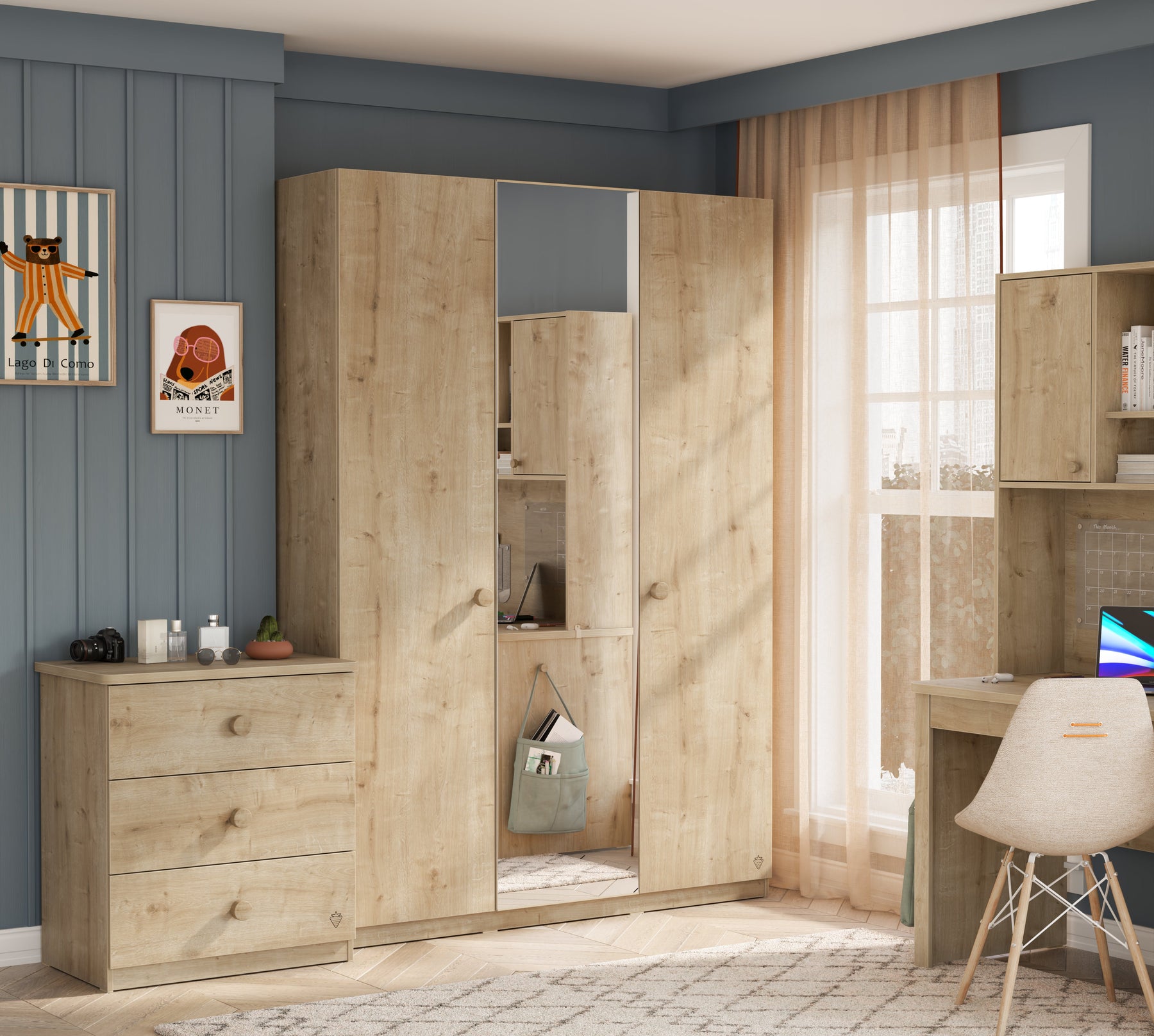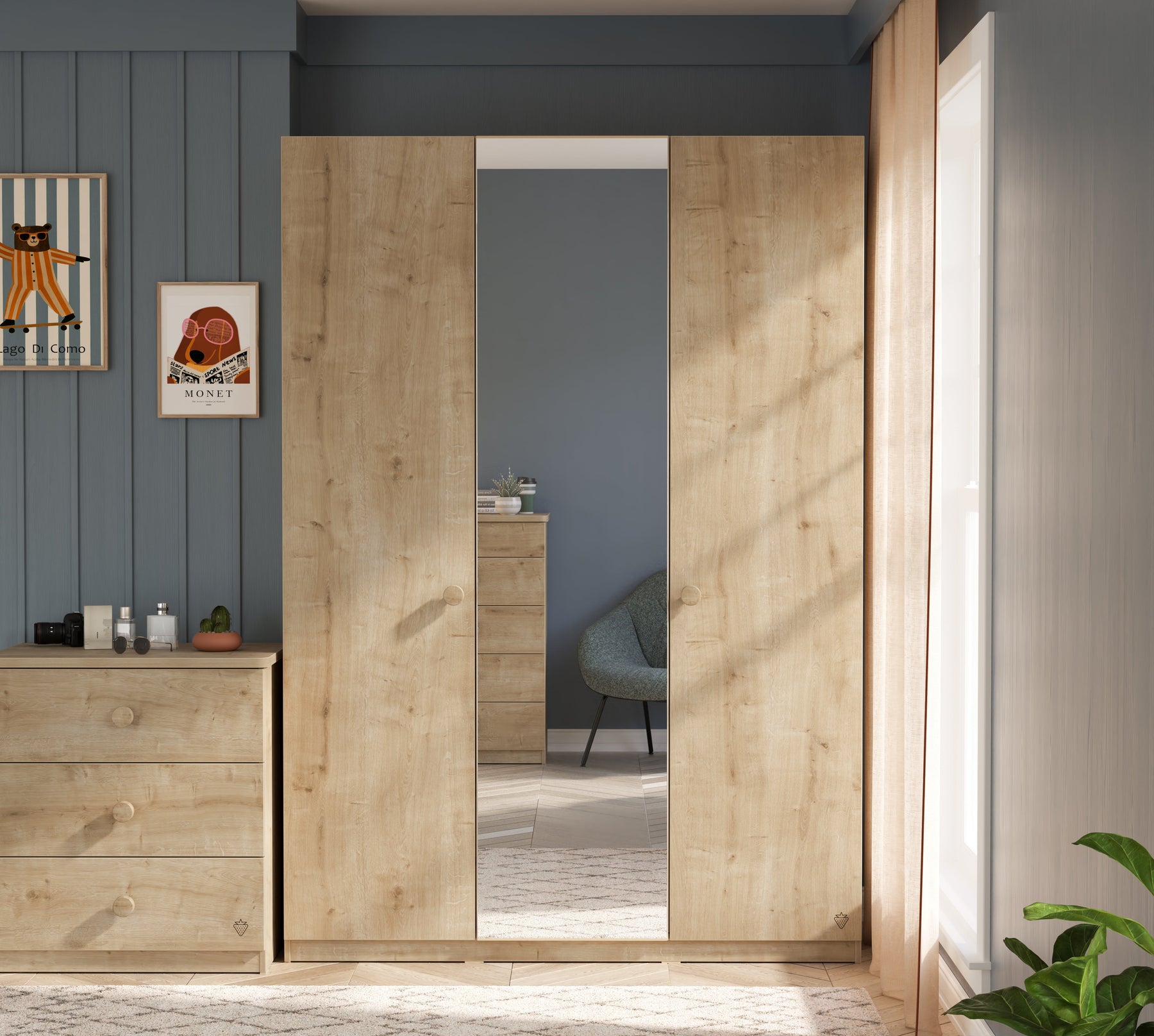 يتميز خزانة موكا ثلاثية الأبواب مع مرآة بخطوطه الطبيعية والحديثة، حيث يقدم كل من الأناقة والوظيفية معاً. تعزز المرآة الكبيرة الموجودة في الباب الأوسط إحساس الفراغ والاتساع في غرفتك، بينما تسهل أيضًا تحضيراتك اليومية.