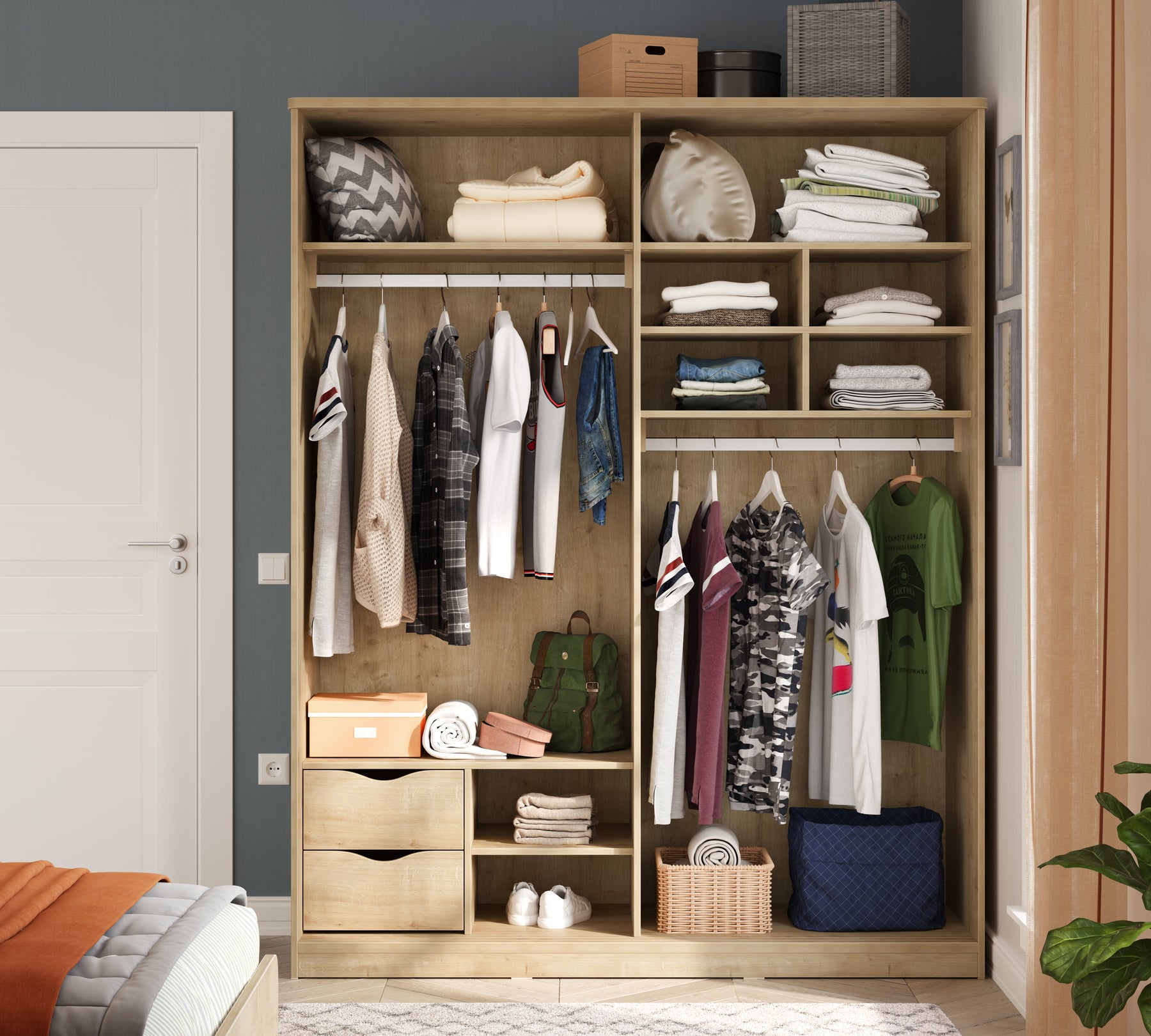 With two hanging areas, numerous shelves, and handy drawers in its interior design, it offers an organized storage space for everything from your clothes to your accessories. The tandem rail drawers on the left side provide easy and silent usage, while the wheeled system and stop plastics of the sliding doors ensure a durable and comfortable experience.