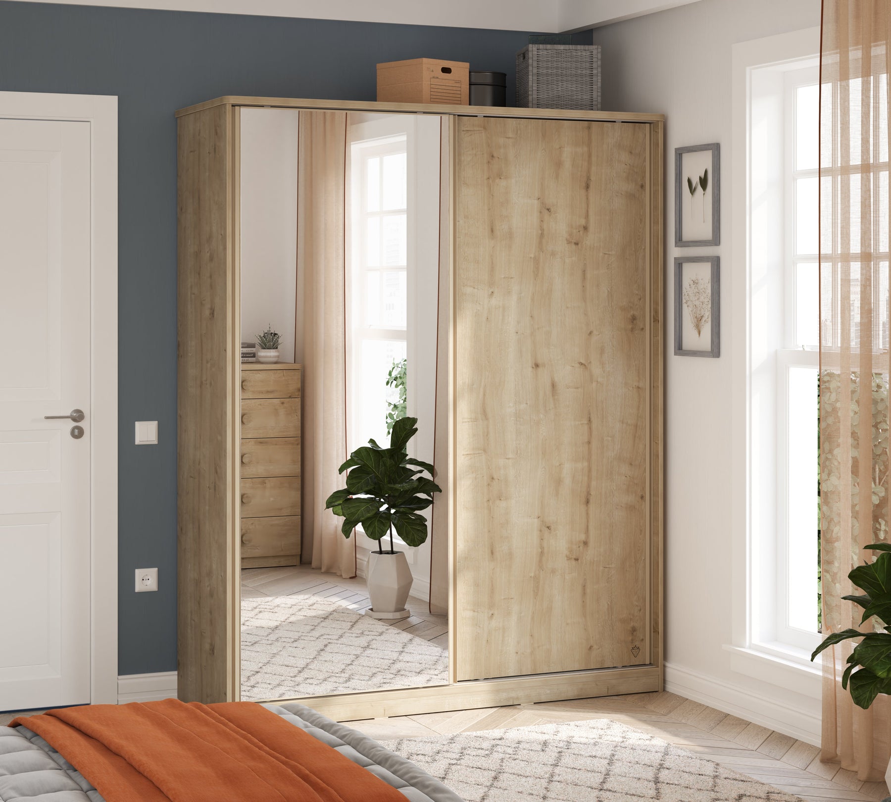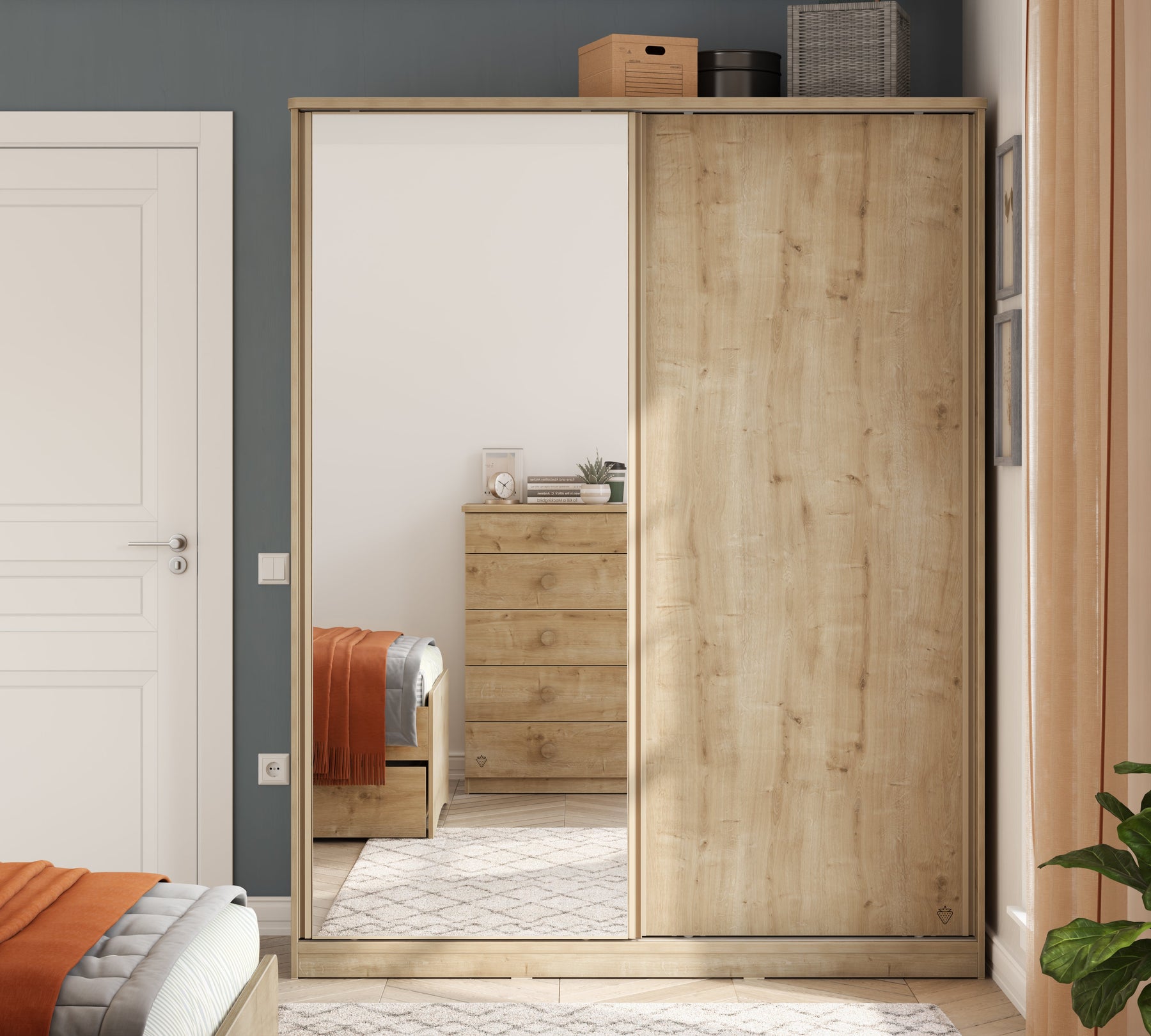 The Mocha Sliding Wardrobe, which stands out with its modern design and functional structure, brings elegance and practicality to your room. The full-length mirror on the left door adds spaciousness to your room and facilitates your daily use. The special laser-engraved Strawberry logo on the right door gives the wardrobe an elegant and unique character.