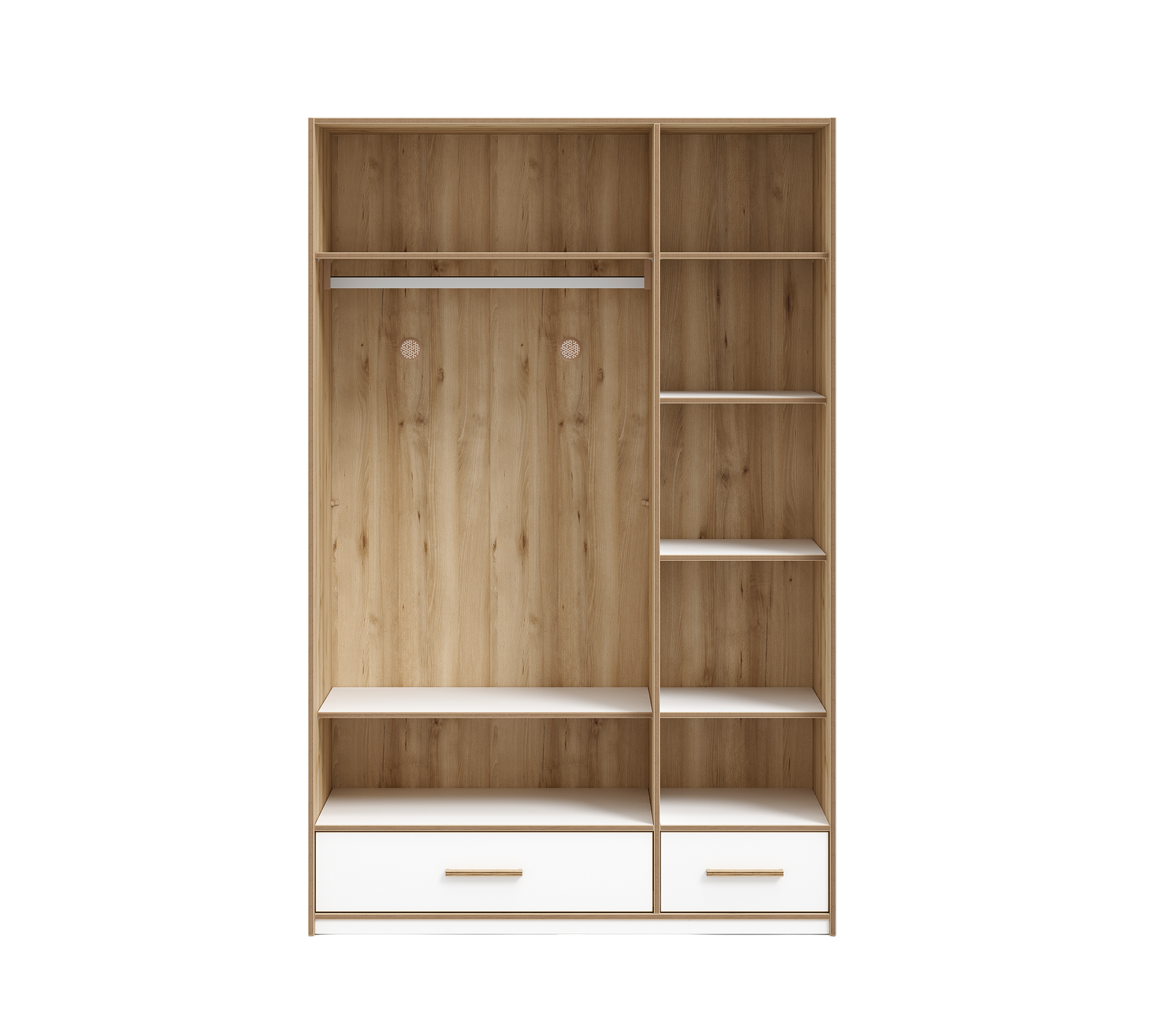 تضفي المقابض الخشبية بلون الزان والجوز، ونظام الرفوف القابل للتعديل، وبار الملابس الواسع، وكبسولات التهوية، والأدراج المقسمة، ومرآة رياضية داخل الأبواب، والمنطقة المخصصة للممتلكات الشخصية، الأناقة على خزانة موديرا ذات الثلاثة أبواب، وتوفر إمكانية استخدام واسعة. يوصى باستخدام أداة التوصيل بالجدار المرفقة مع الخزانة لزيادة الأمان أثناء الاستخدام.