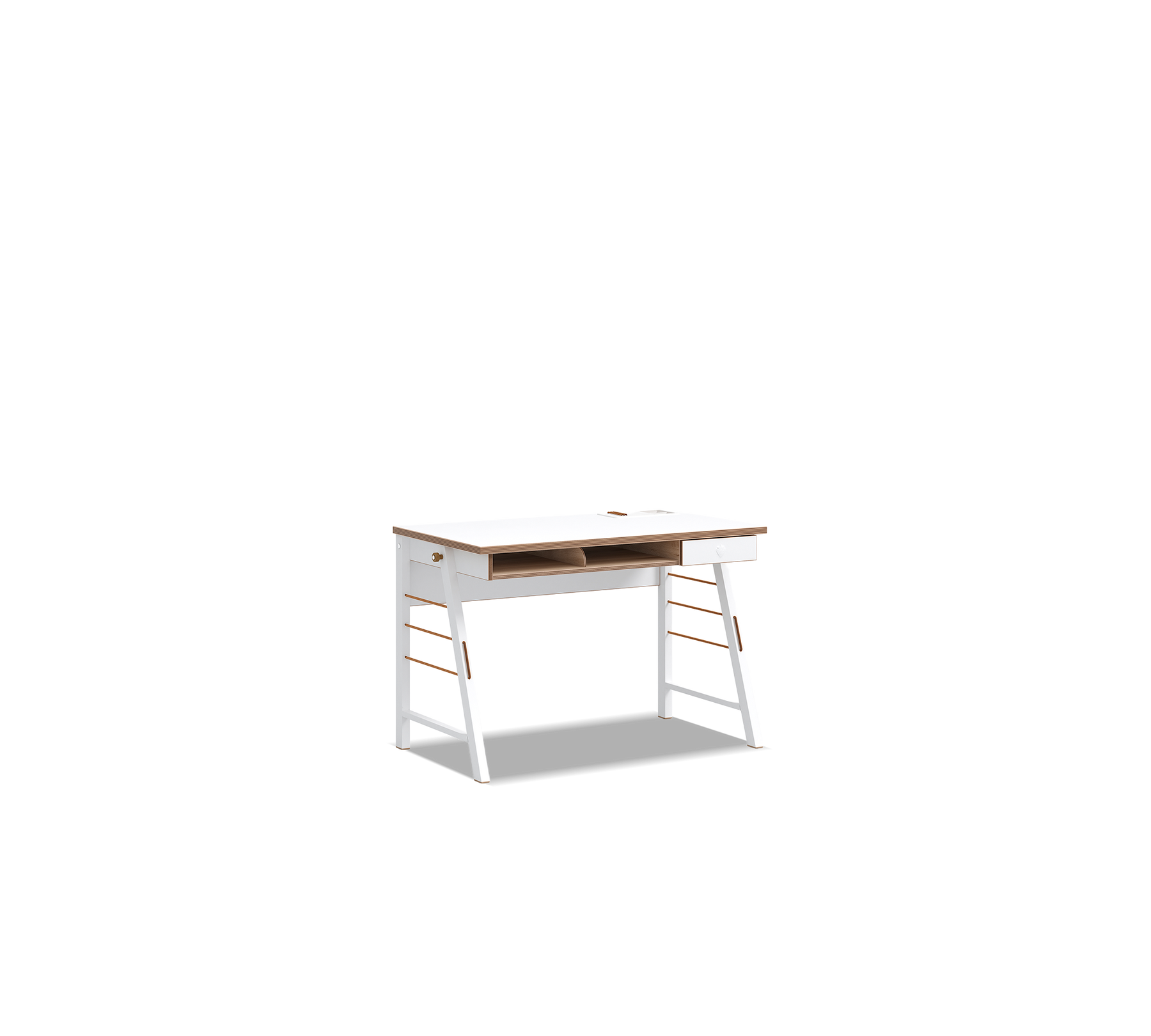 تساعد الرفوف المفتوحة ذات القسمين في الجزء السفلي من مساحة العمل على سهولة الوصول إلى العناصر الضرورية للاستخدام اليومي، بدءاً من الكتب إلى المفكرات. تعزز الأرجل المعدنية المستخدمة على جانبي الطاولة التصميم بمظهر عصري بينما تبرز قوتها. يوفر تفصيل التعليق الموجود على الأرجل المعدنية إمكانية تعليق العناصر مثل الحقيبة أو سماعات الرأس بشكل منظم. توفر المطاطية المضافة بين الأرجل استخداماً لتقليل الصوت وتخفيف الصدمات.