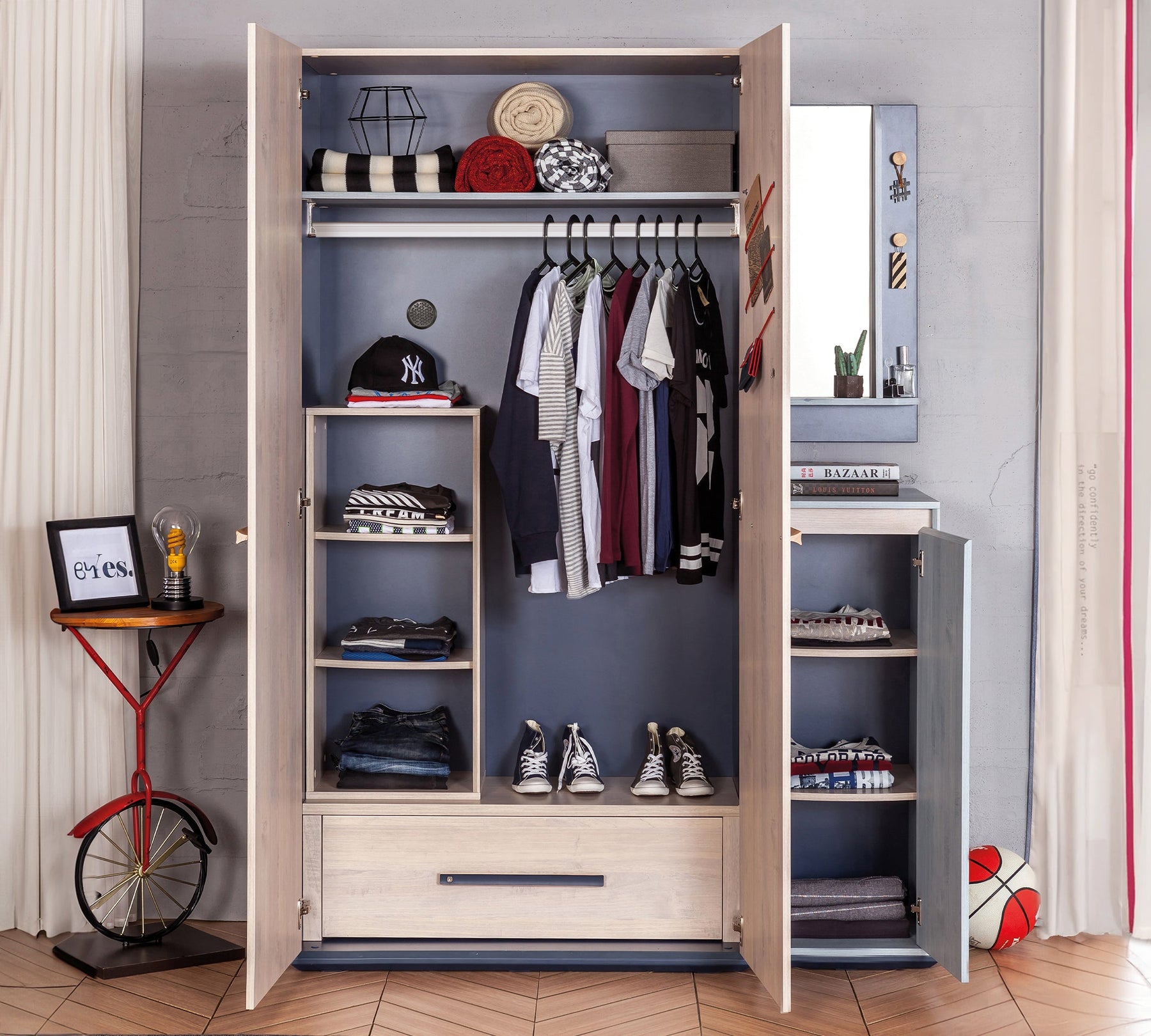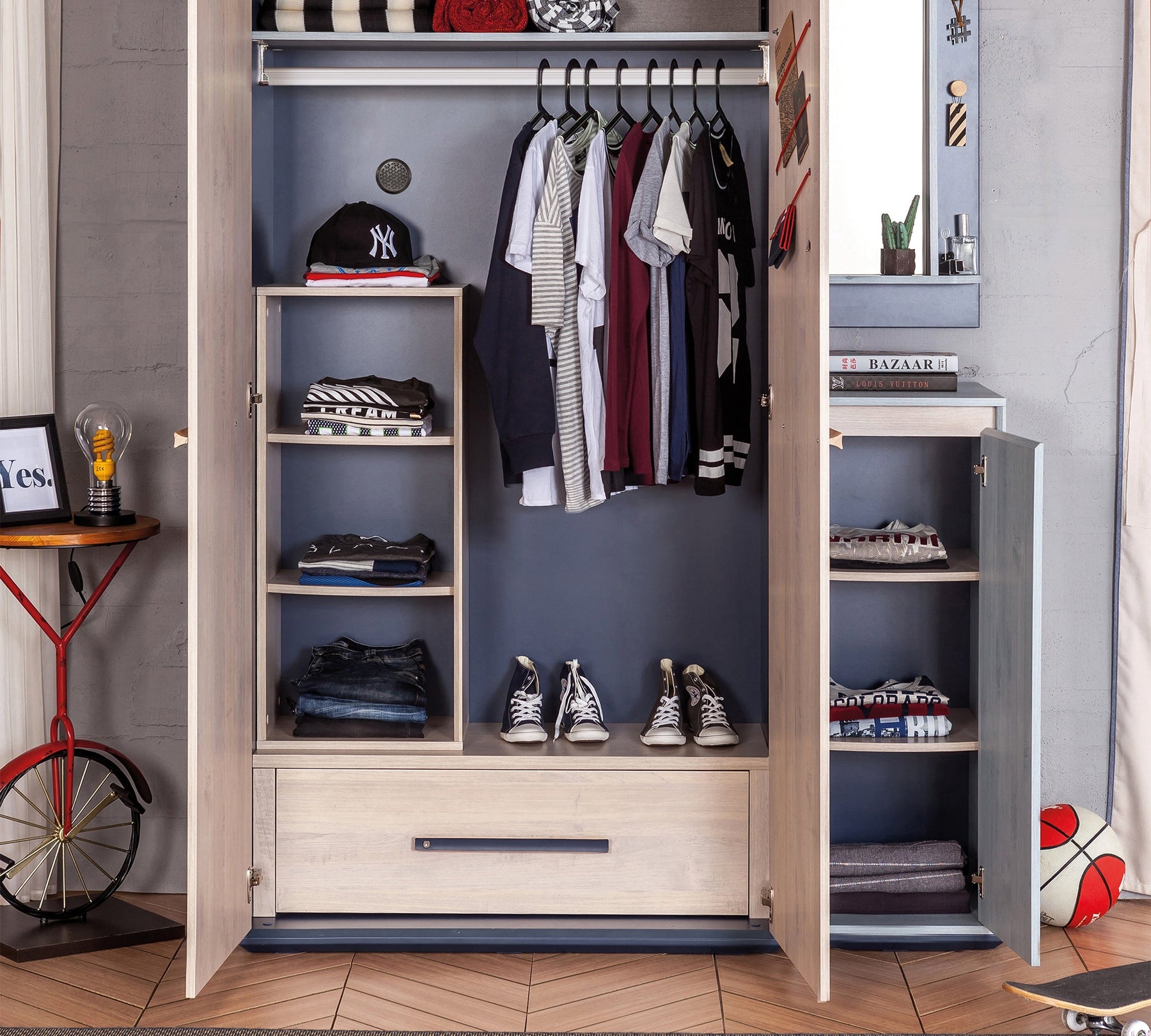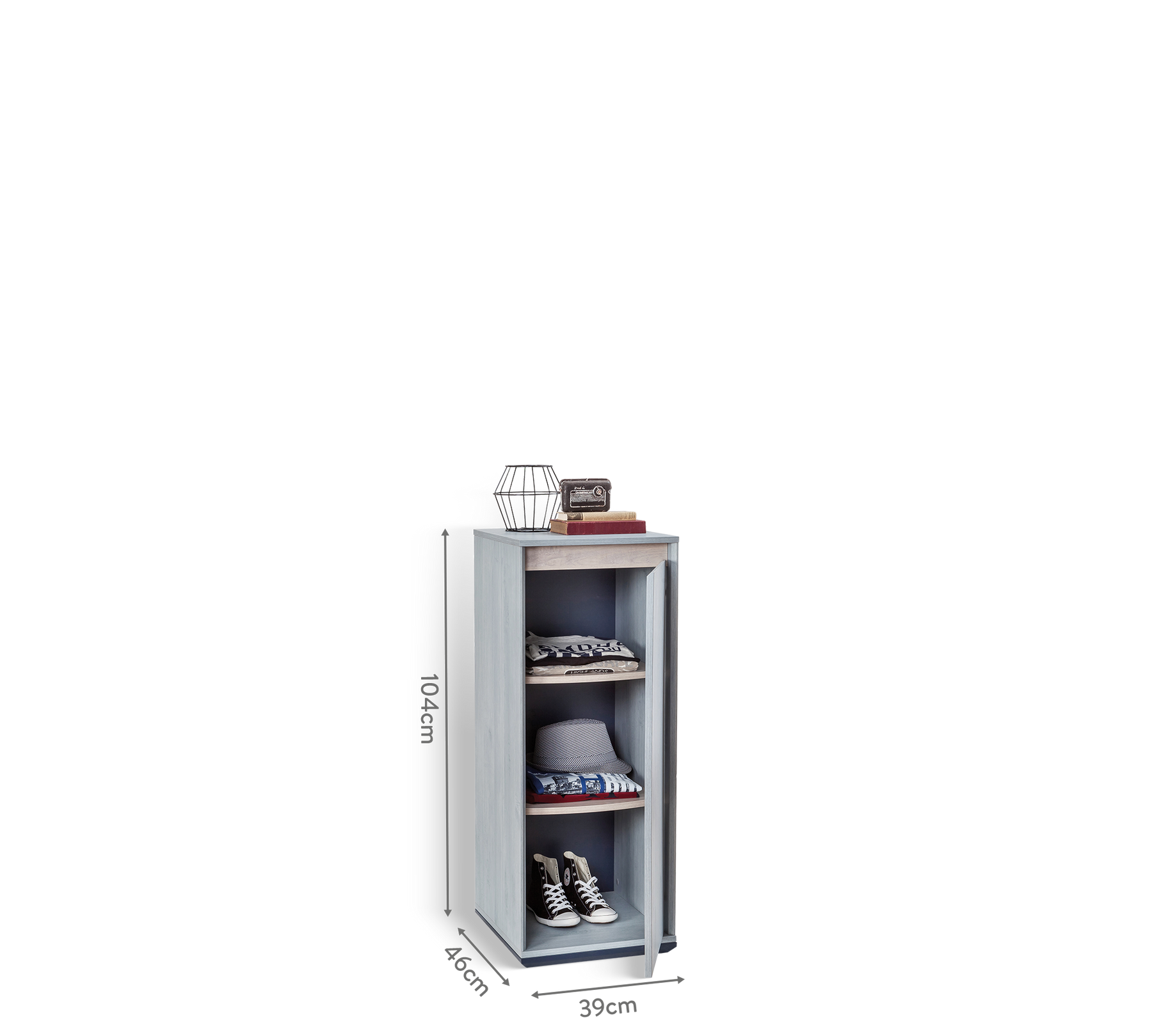 تحتوي على ثلاثة رفوف يمكن استخدامها لتخزين الملابس، والصناديق، والأحذية، أو أي أغراض شخصية أخرى. الباب المصنوع من مواد متينة يفتح ويغلق بسهولة وأمان. مع تصميمها باللون الرمادي الفاتح، تضيف خزانة Trio صغيرة جوًا هادئًا إلى غرف الشباب، وتعتبر واحدة من أكثر المنتجات العملية والفعلية في هذه الغرف.