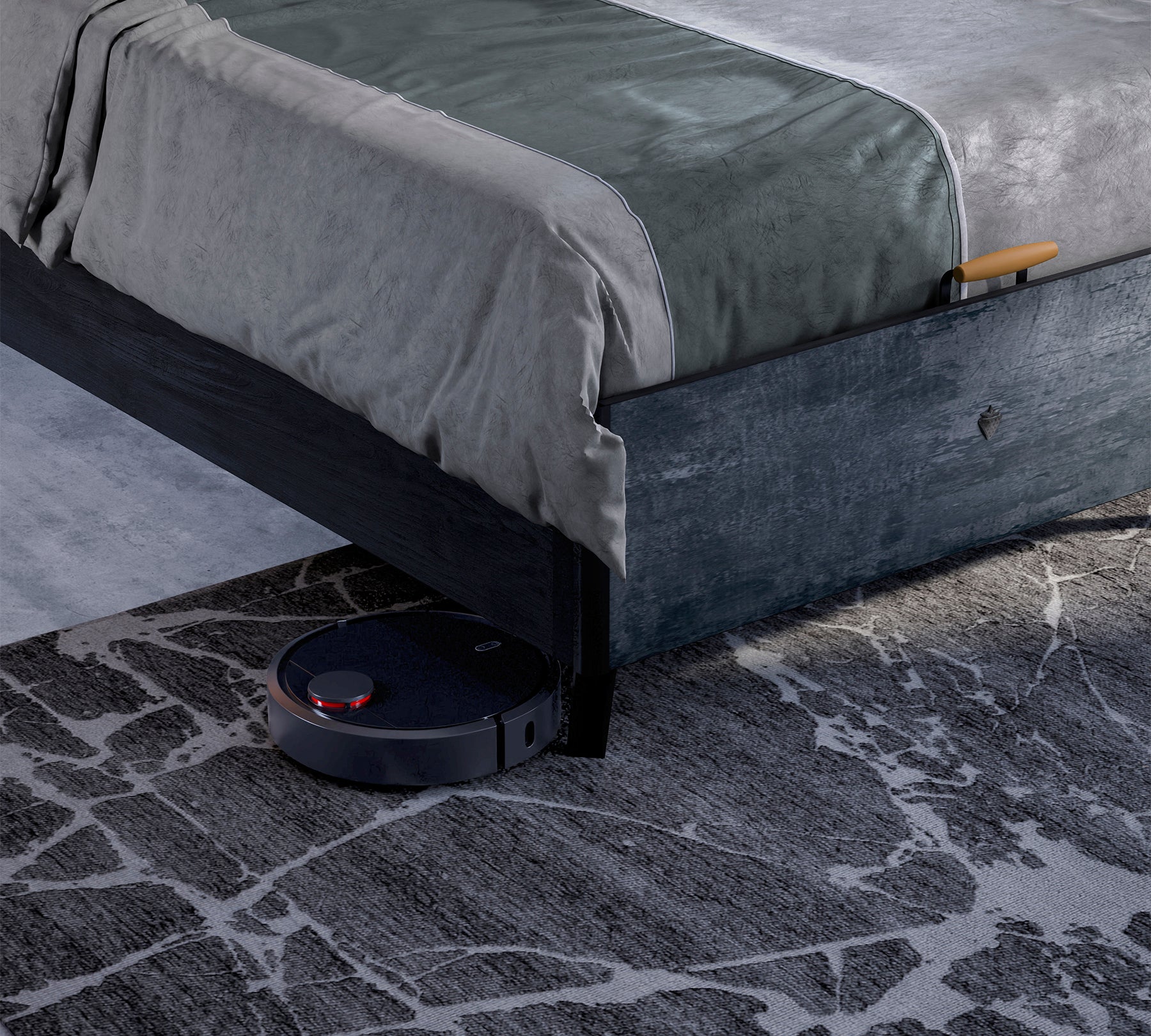 The bed is designed with a 12 cm height to ensure that the space underneath can be easily cleaned by a robot vacuum.