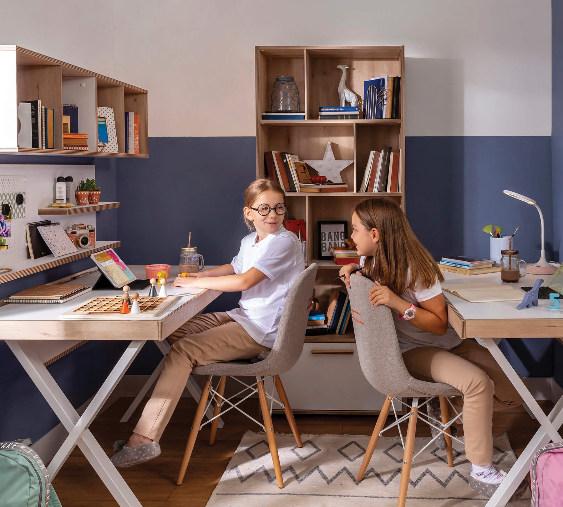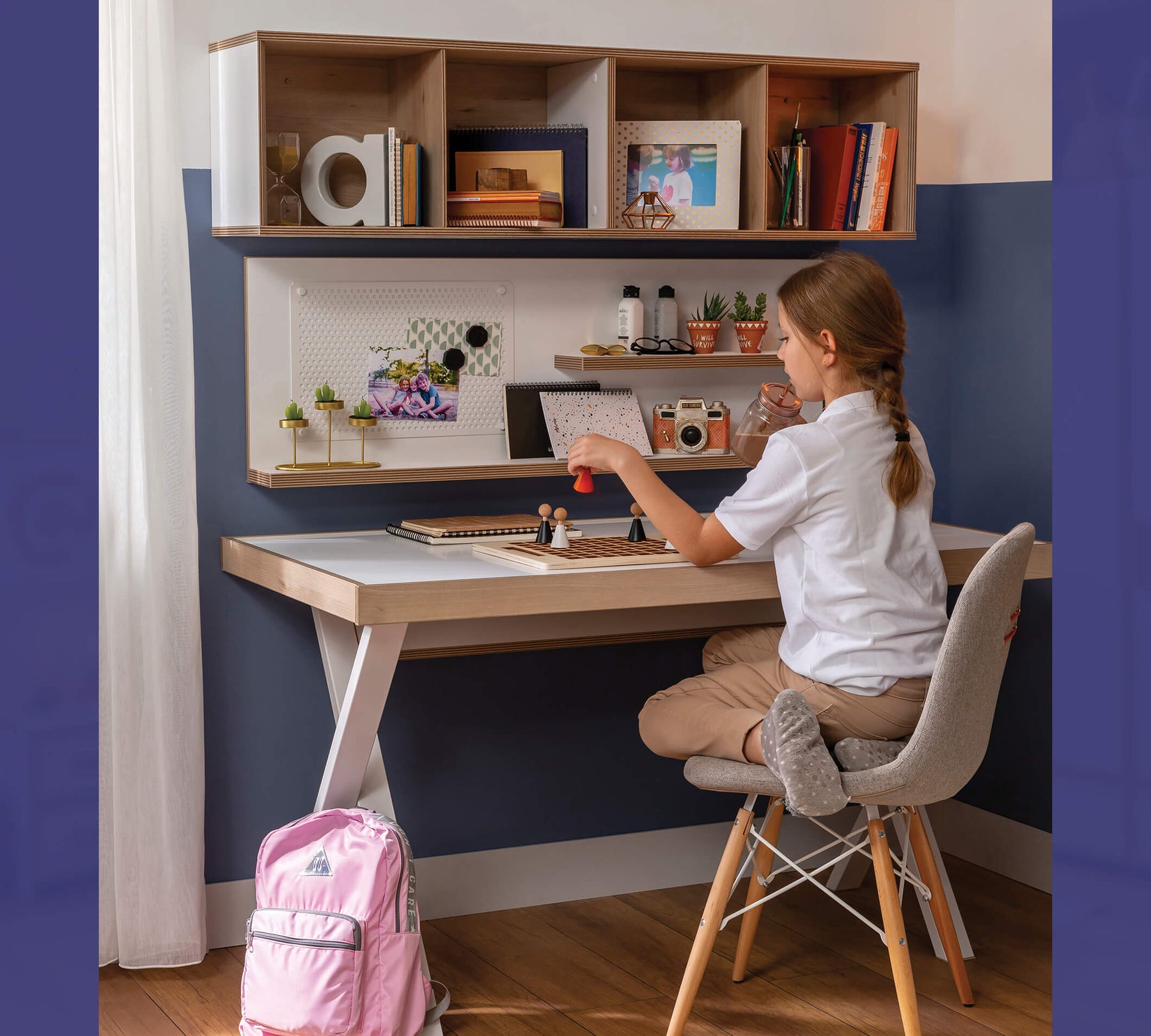 تم تصنيع الأرجل المتقاطعة من المعدن ومطلية بالبودرة، مما يوفر تجربة استخدام قوية وموثوقة. تحتوي الوحدة على قسم خلفي علوي لوضع الأدوات المكتبية الصغيرة، مما يساعد طفلك على تنظيم مكتبهم بشكل فعال.