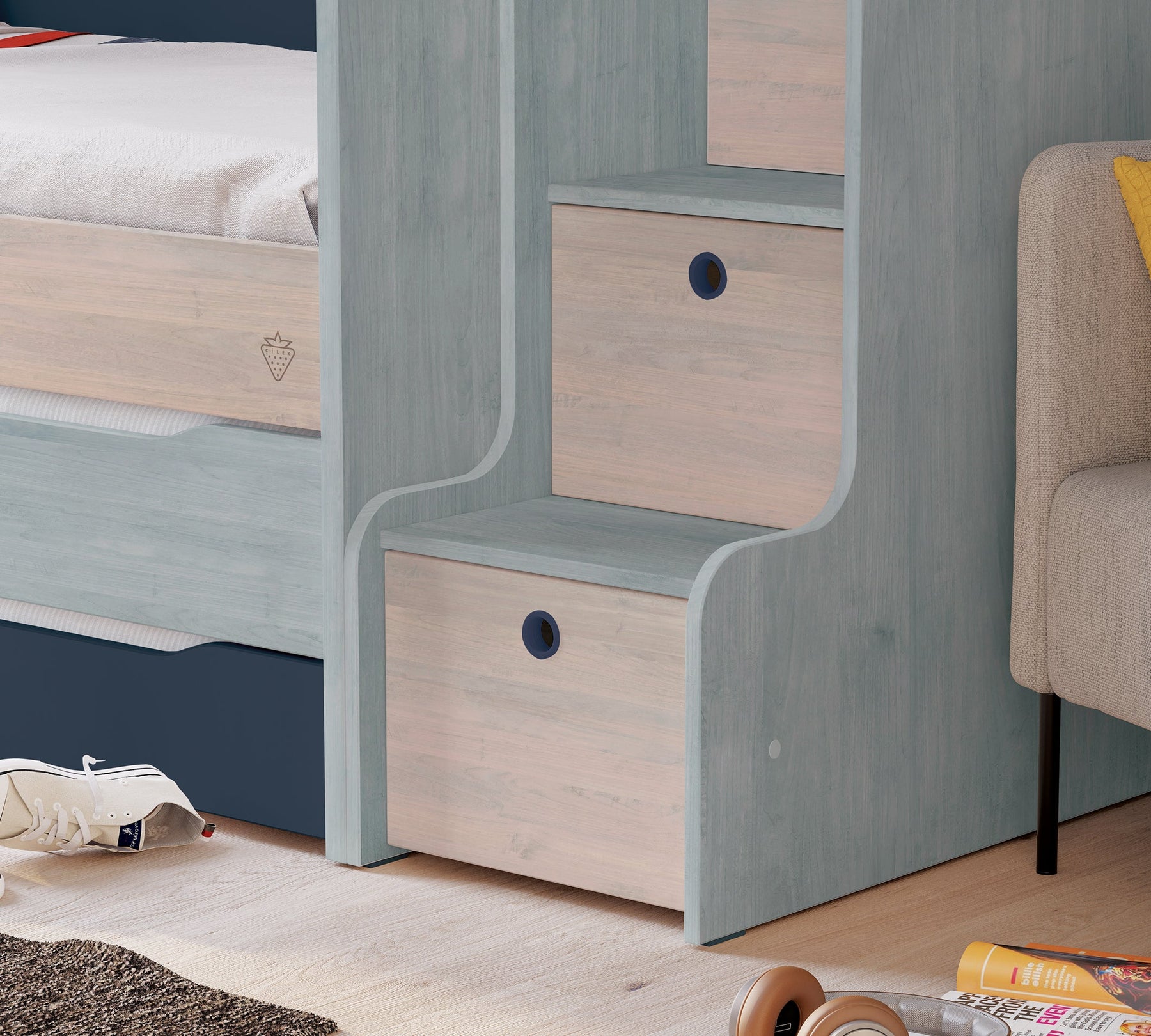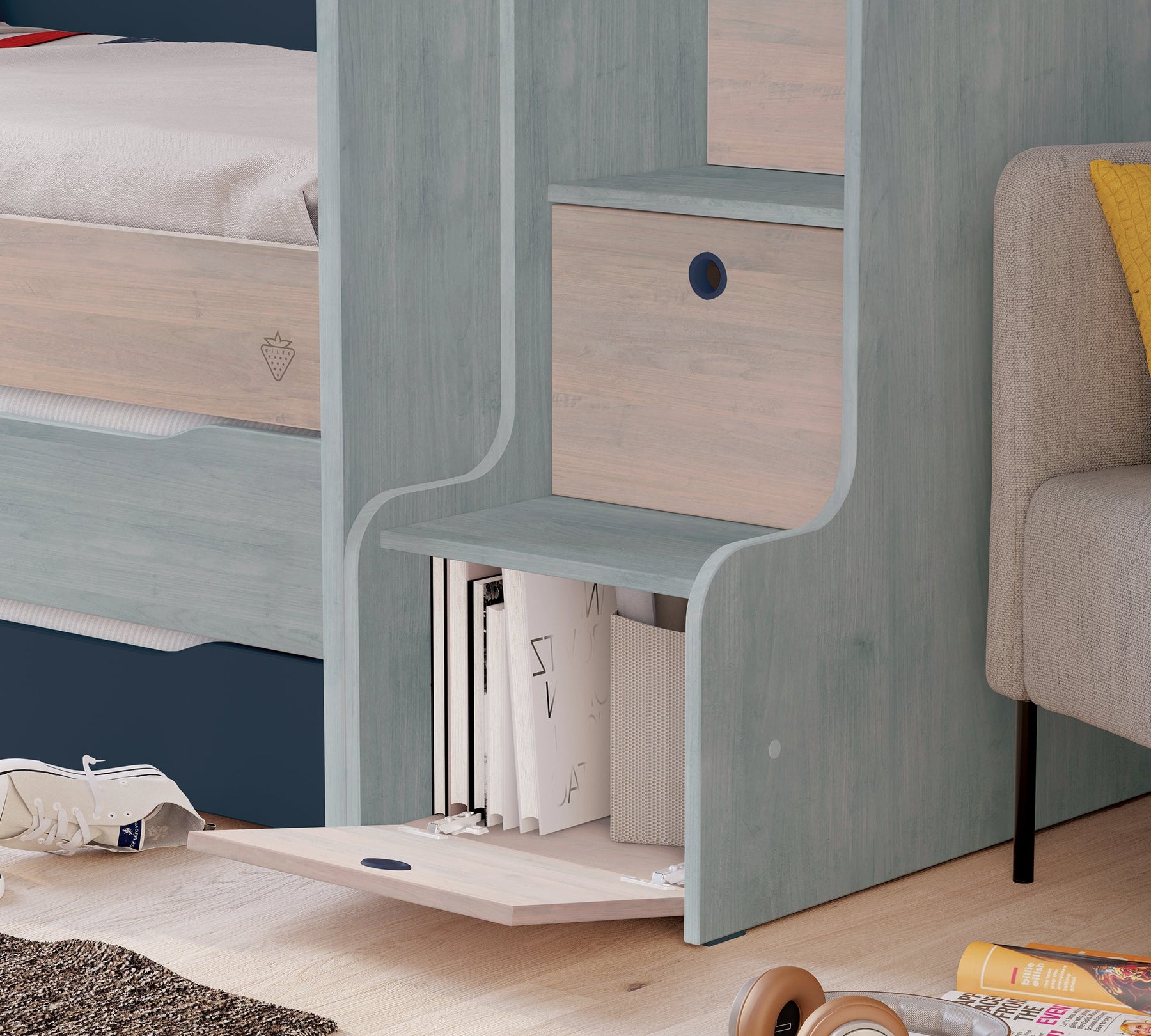 The Trio Studio Staircase With Cabinet offers extra storage space for youth rooms, as it has a cabinet function with its four stairs of different depths.