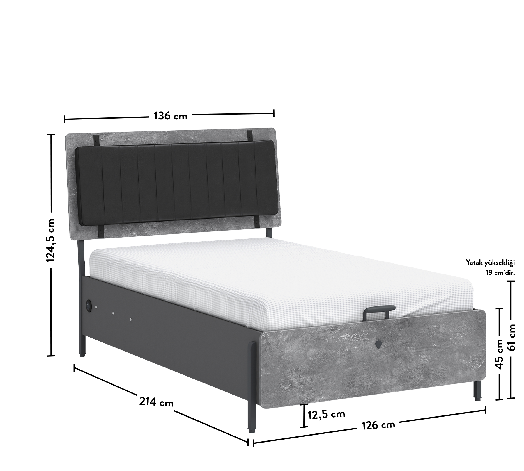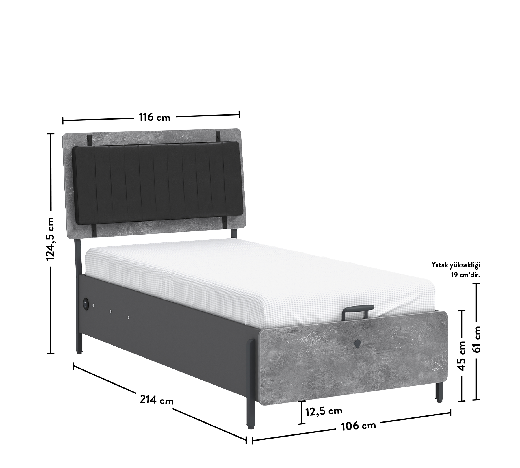 Space Gray Bed with Base 100x200 and 120x200 cm is designed with a simple and free design concept. Offering ample solutions for your unused items, the storage space of the Space Gray bed with base clears space for your belongings, creating a comfortable and relaxing area.