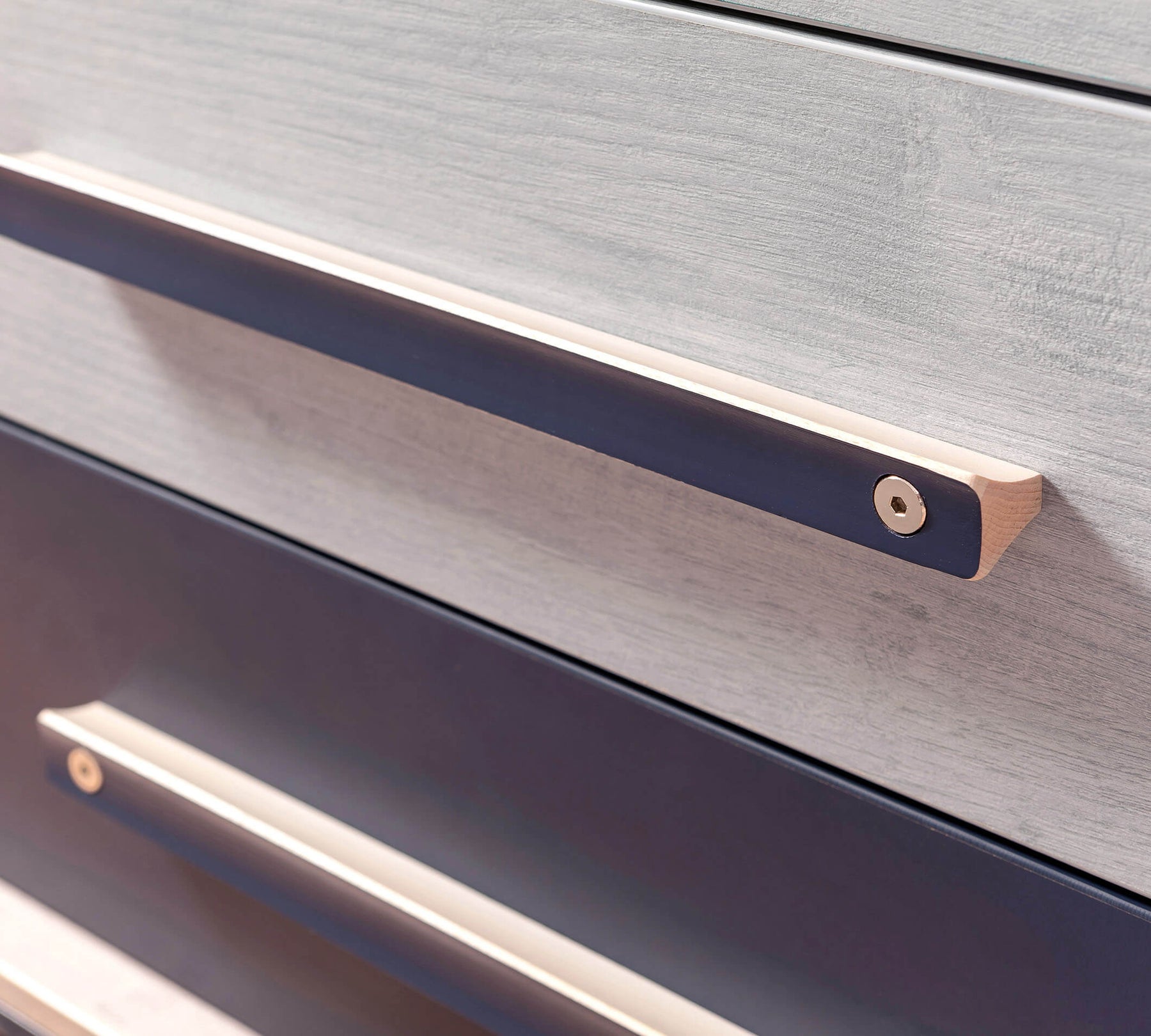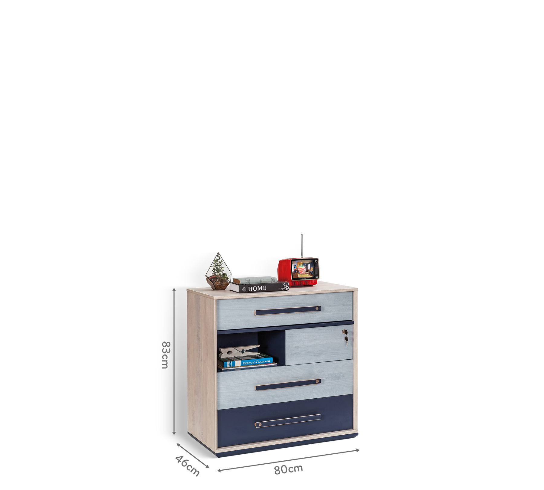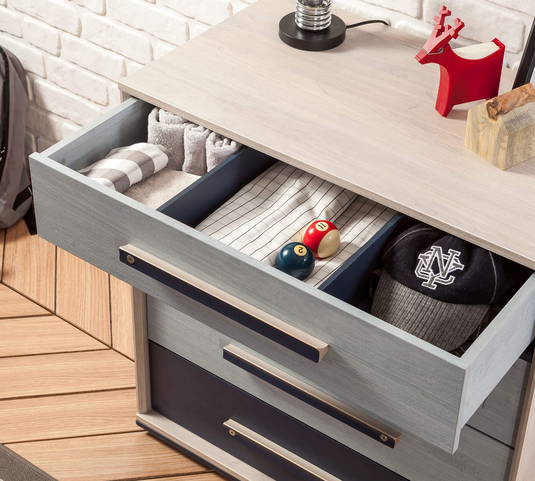 With the harmony of light gray and navy blue colors, it achieves an aesthetic and stylish look. Developed to organize young people's belongings, the Trio Dresser becomes one of the most used furniture pieces in youth rooms thanks to its functional design.