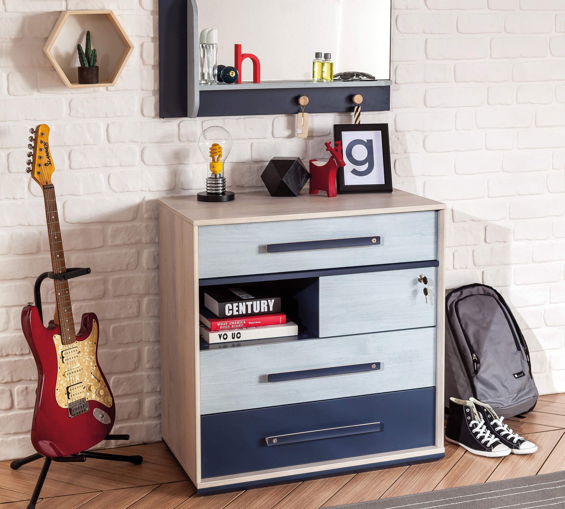 The Trio Dresser brings a fresh atmosphere to the living space of youth with its simple and modern design. The four-drawer Trio dresser, used to organize personal items, also features one lockable drawer for added security.