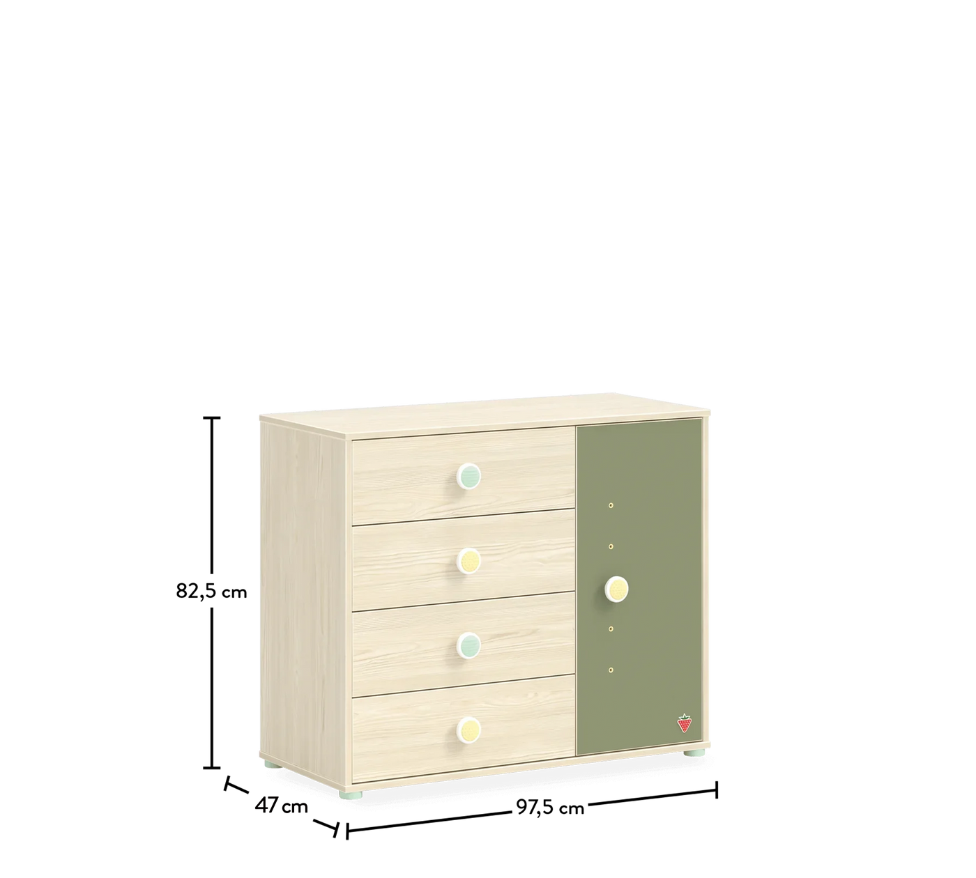 The Montes Natural Dresser with Doors is highly functional with its four drawers and a section with doors. The self-softening feature of the drawer rails combines silence with a reliable structure. The removable shelf in the cabinet section can be adjusted to four different height options according to your preference. The decorative charm of the soft-textured finish, combined with the dresser's two different handle design options, will captivate both you and your baby.