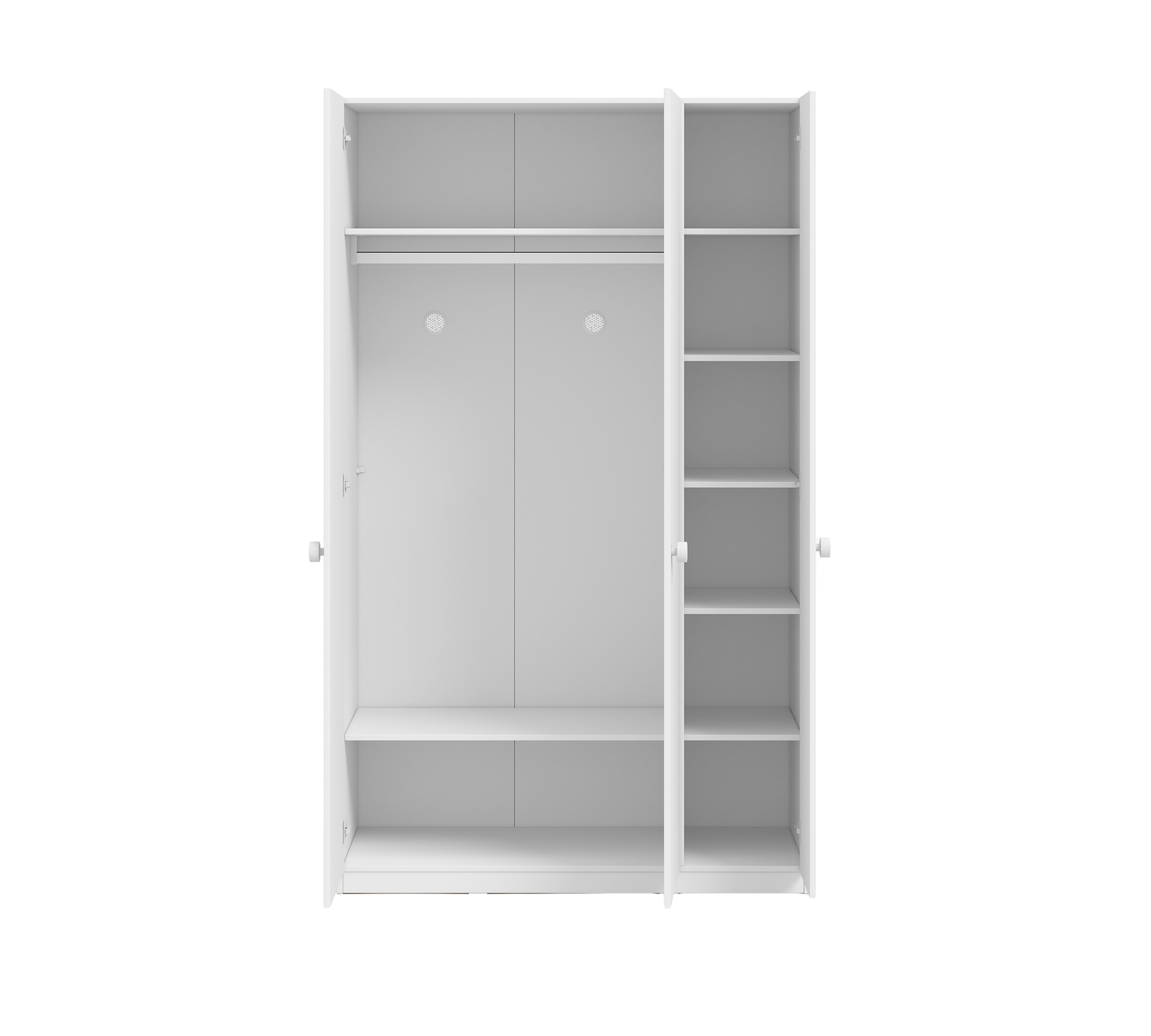 3-door design; includes a hanging rod and multiple shelves inside. It features a brake hinge, wooden handle, and ventilation plug. There is a wall connection to prevent tipping.