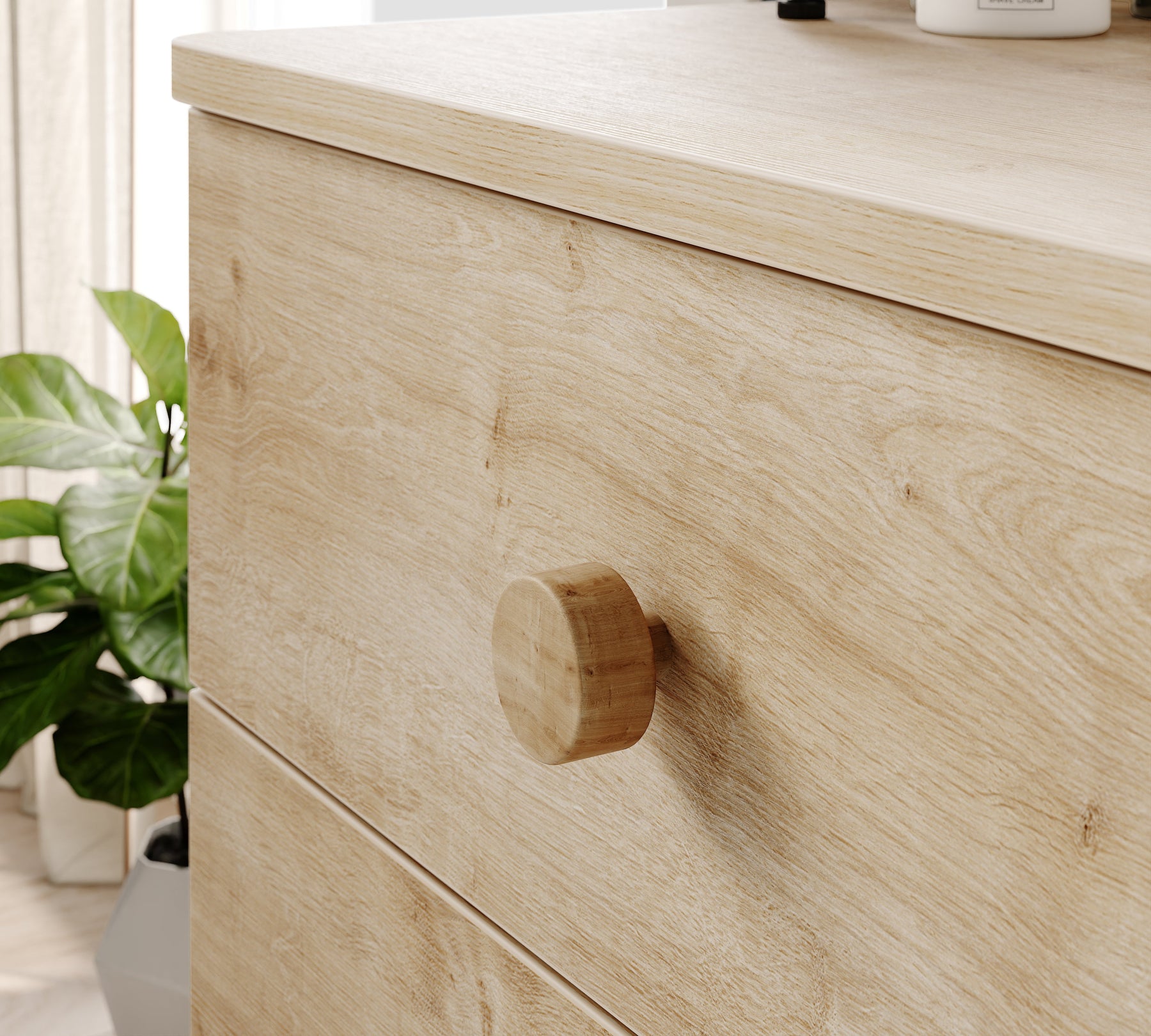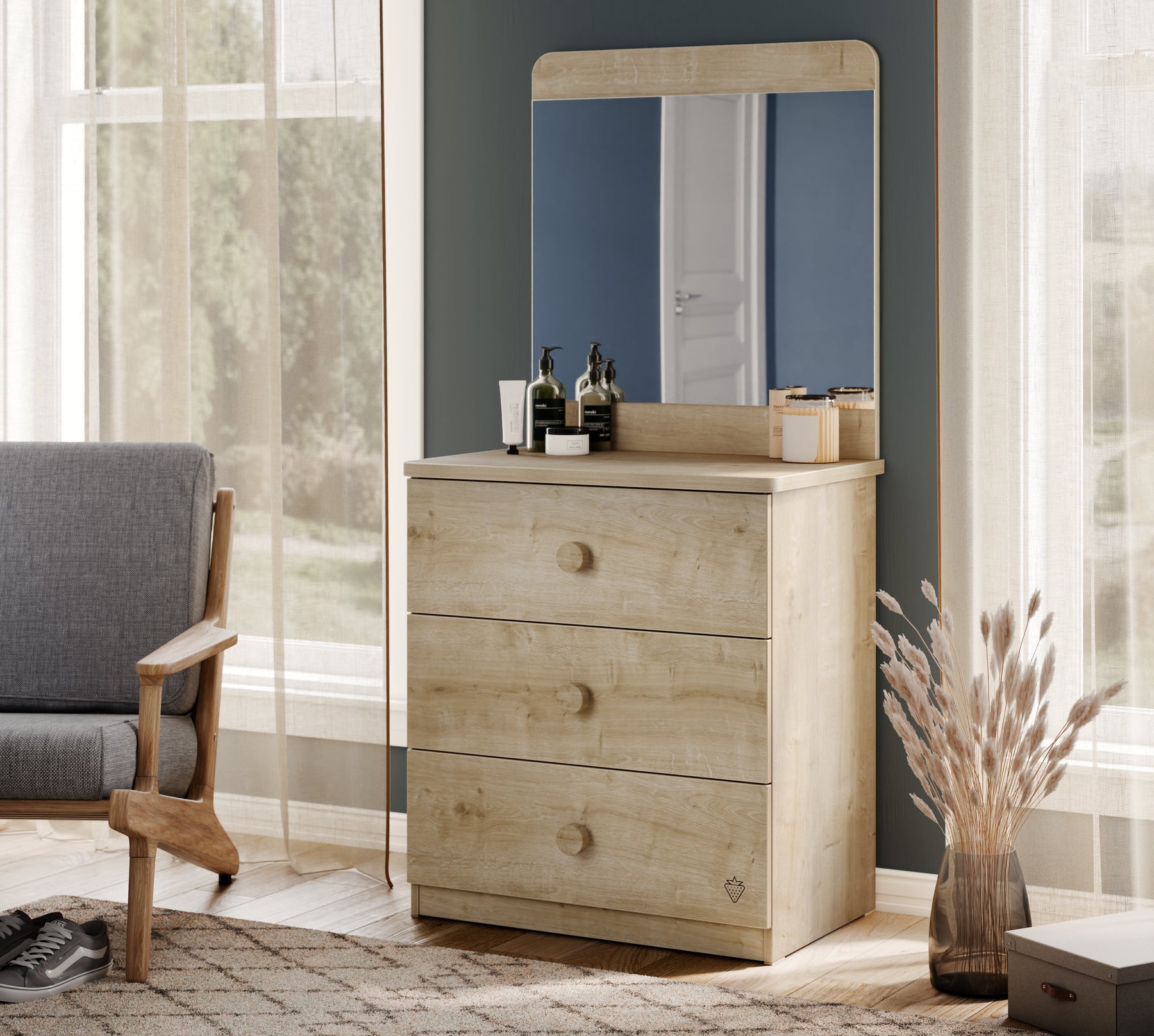 Der Mocha Spiegel-Kommode bietet mit seinen drei geräumigen Schubladen einen praktischen Stauraum und verleiht jungen Wohnräumen durch die Holzgriffe und die natürliche Optik eine schlichte Eleganz.