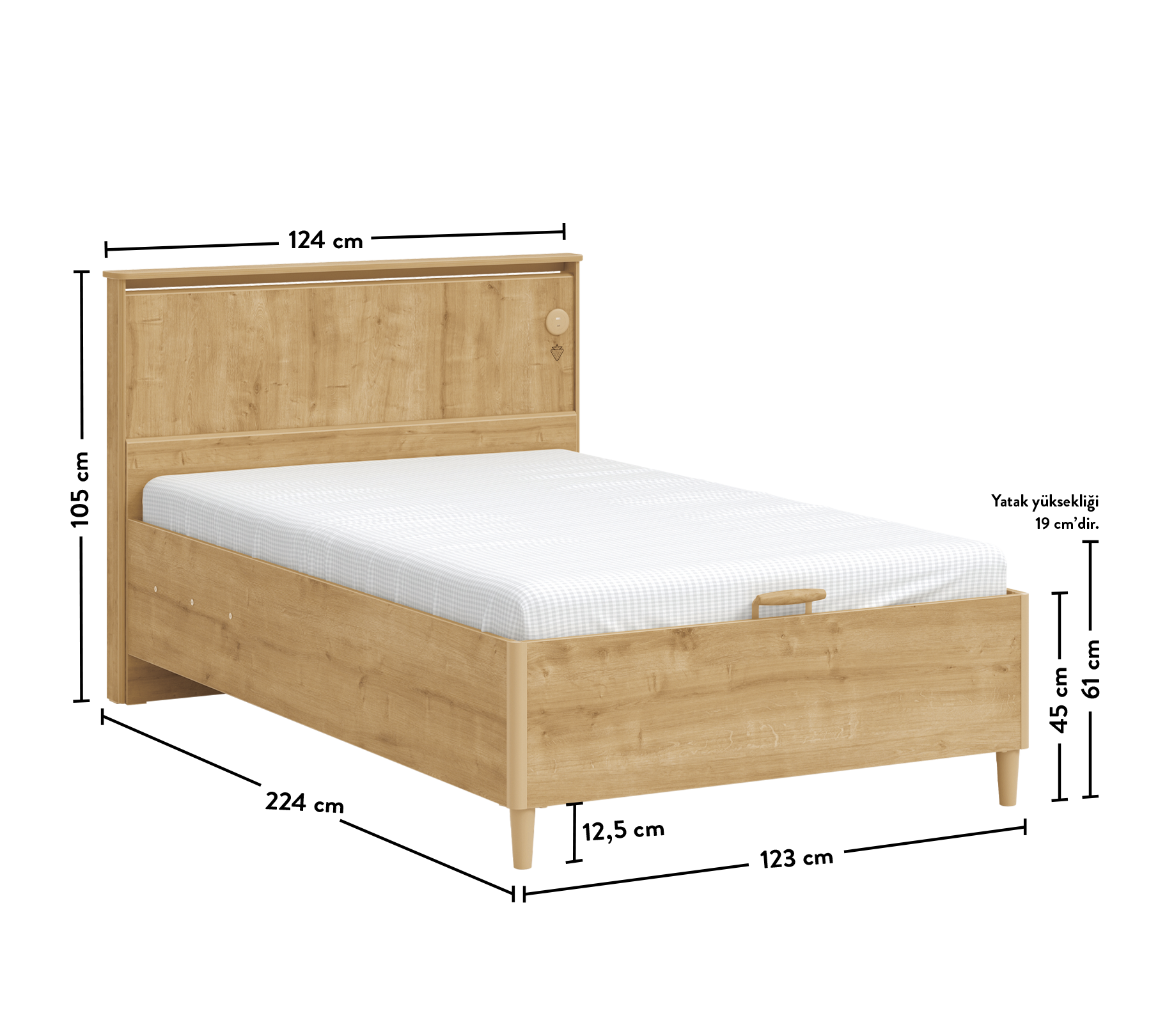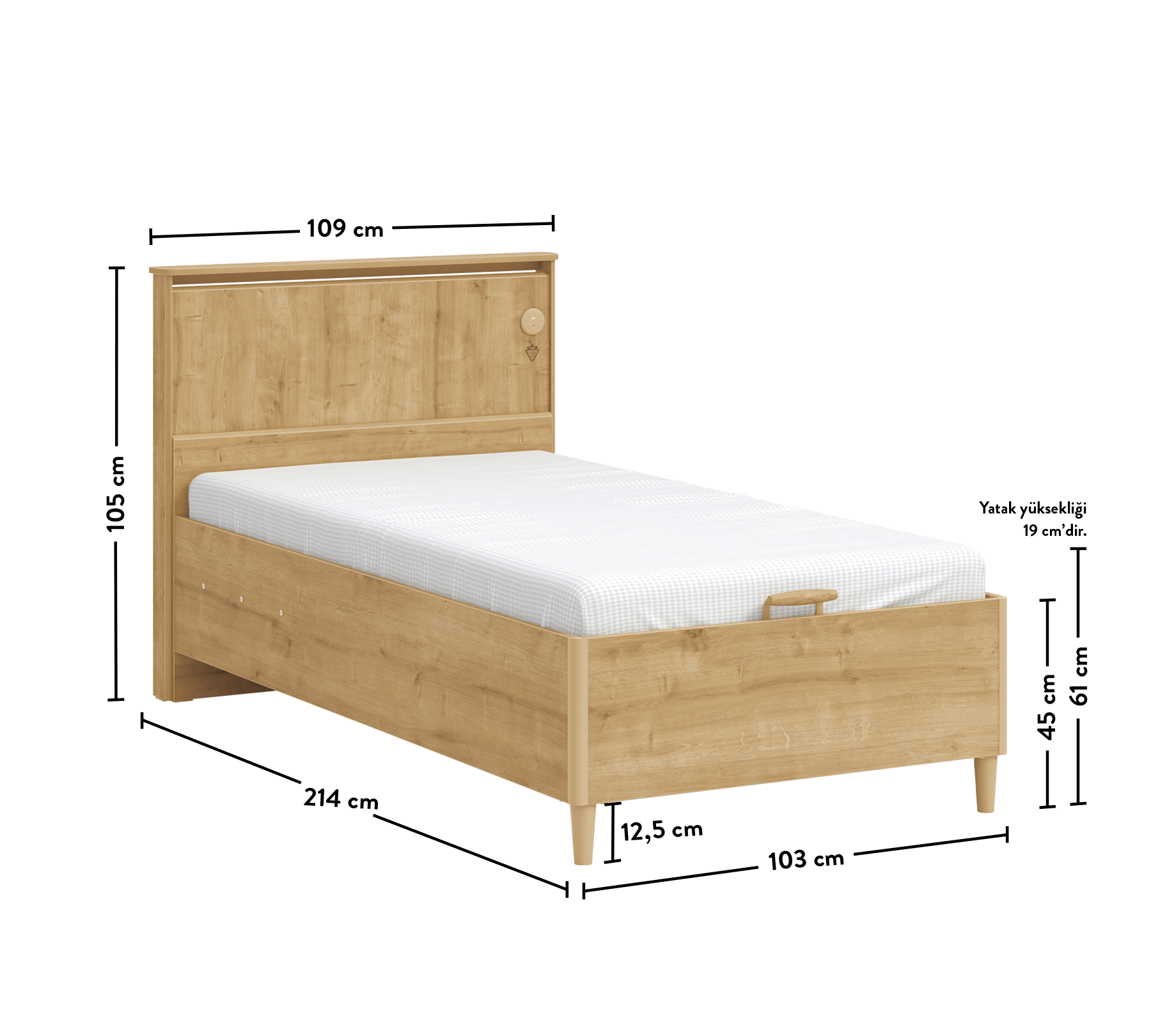 The bed base designed for small rooms features a leg structure with a height of 12 cm, allowing for the use of robotic vacuum cleaners.