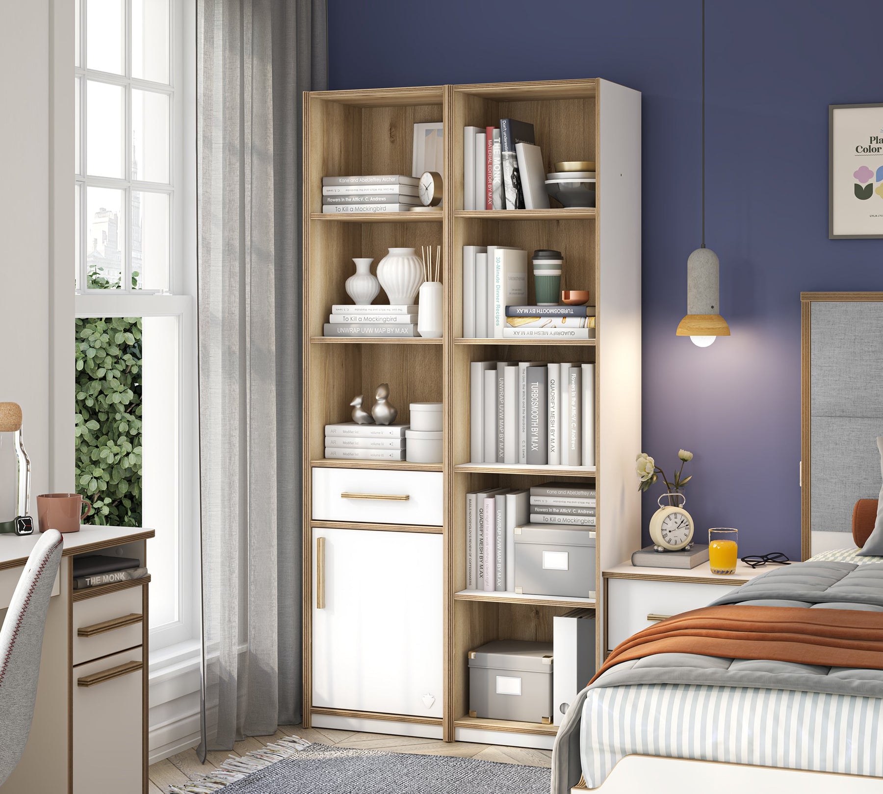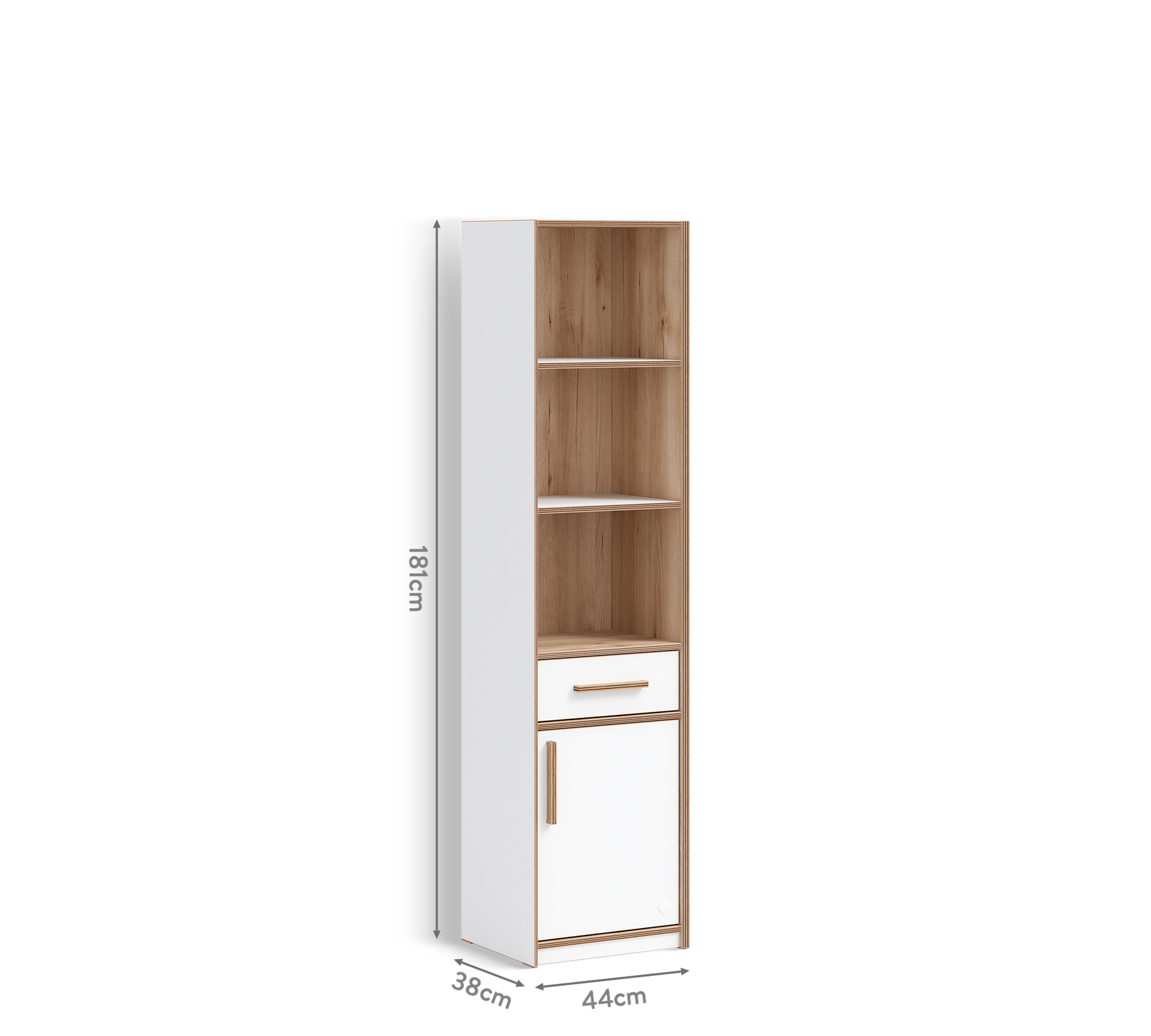 Das Modera Bücherregal mit Schublade wird in einer harmonischen Kombination aus Weiß und Holzfarben entworfen und vervollständigt die moderne Linie der MODERA-Serie. Dank seiner schmalen und langen Bauweise kann es selbst in kleinen Räumen problemlos positioniert werden; trotz der kompakten Größe bietet es ein großes Stauraumvolumen.