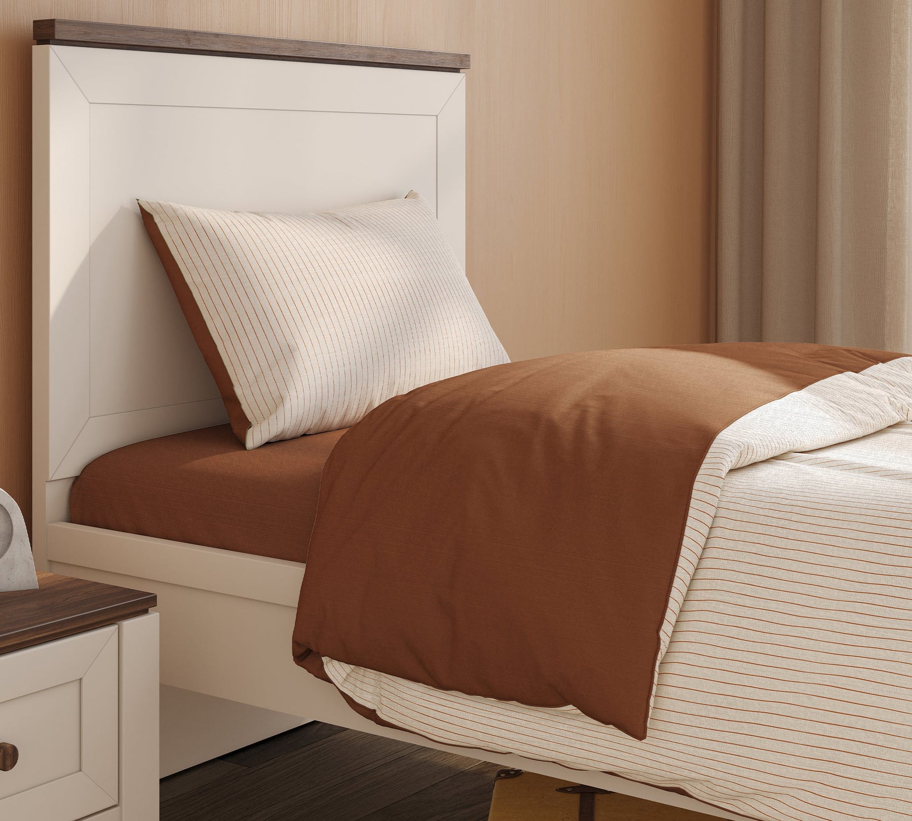 This special set, which offers a soft sleeping experience thanks to its cotton fabric, creates a natural and balanced atmosphere in the room with the warmth of terracotta tones. Its design, which gains movement through solid and striped pattern transitions, appeals to those seeking elegance without compromising on simplicity.