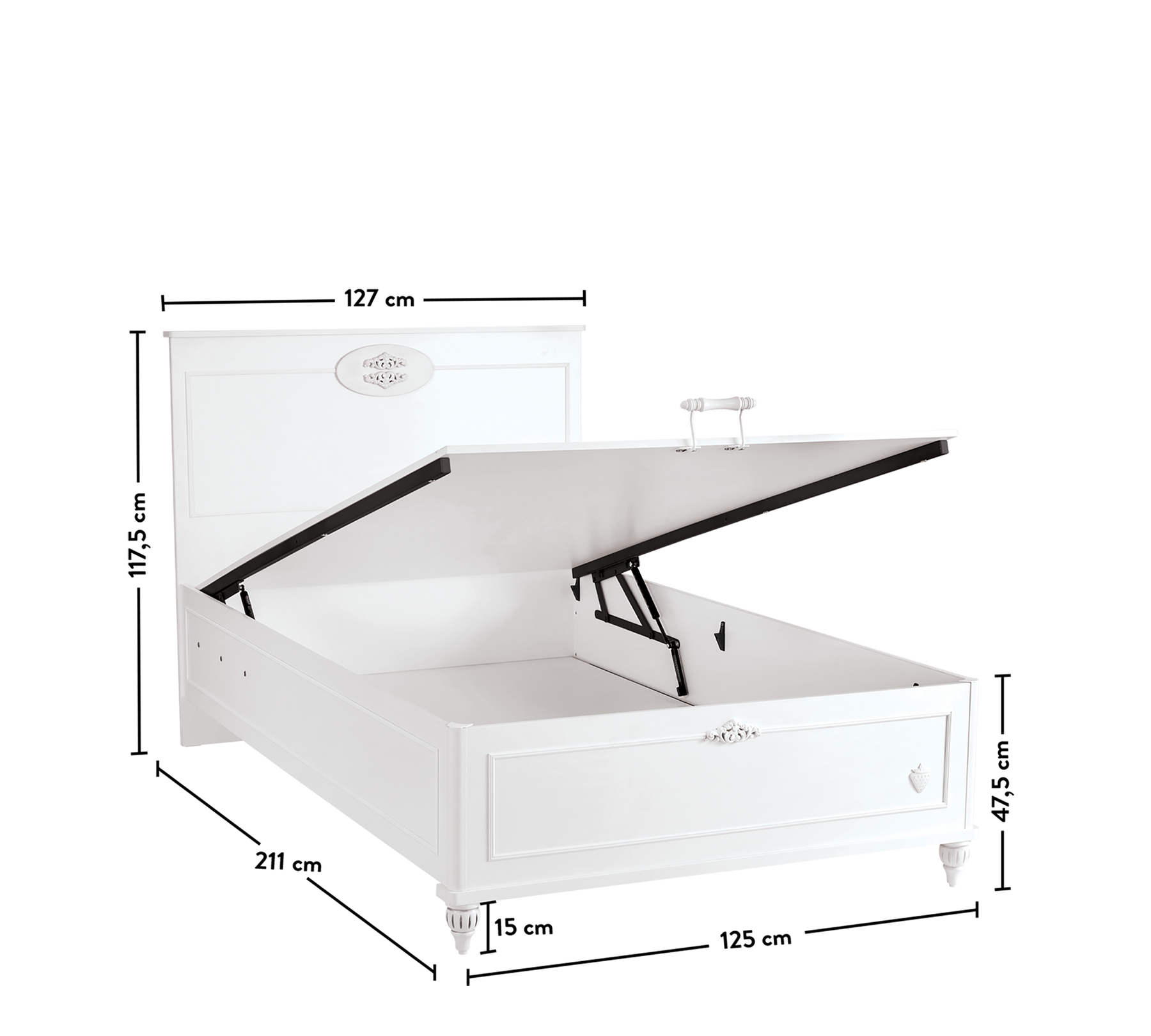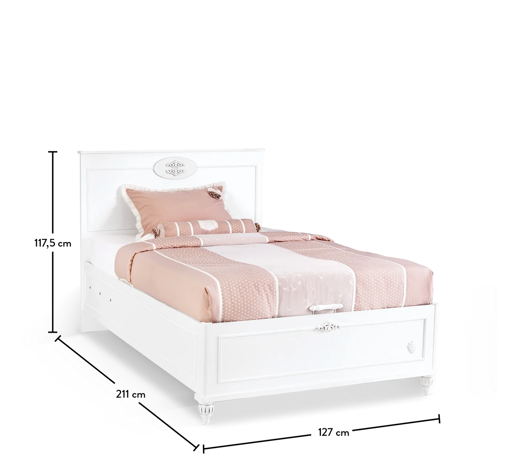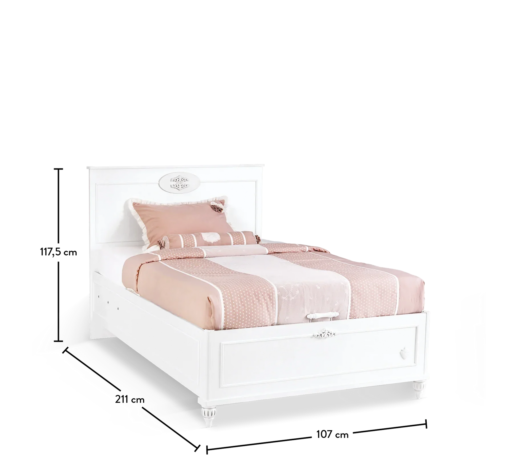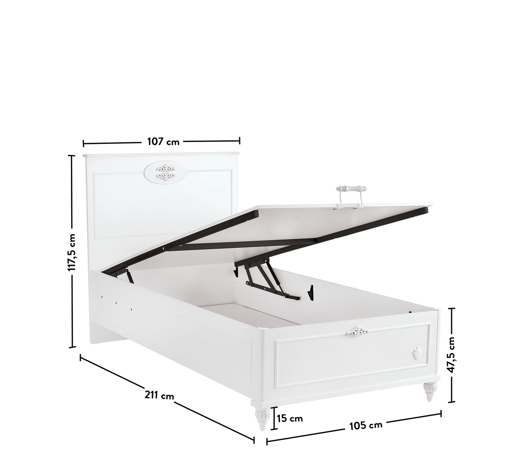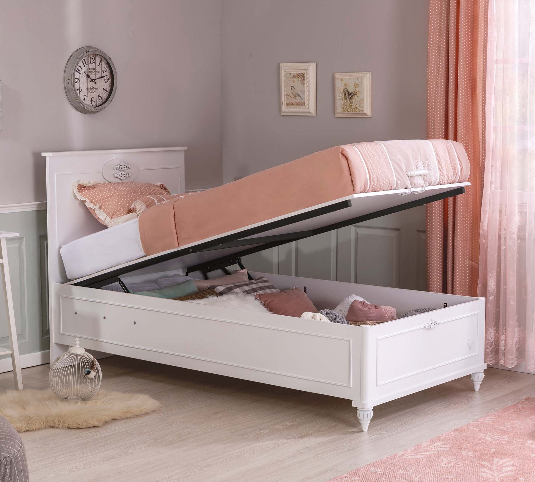 Romantica Bed with Base features an elegant and ergonomic design that reflects the unique style of the collection. The spacious storage base allows you to easily store your child's growing clothes. The safety lock-equipped damper ensures that the base can be opened and closed securely and smoothly.