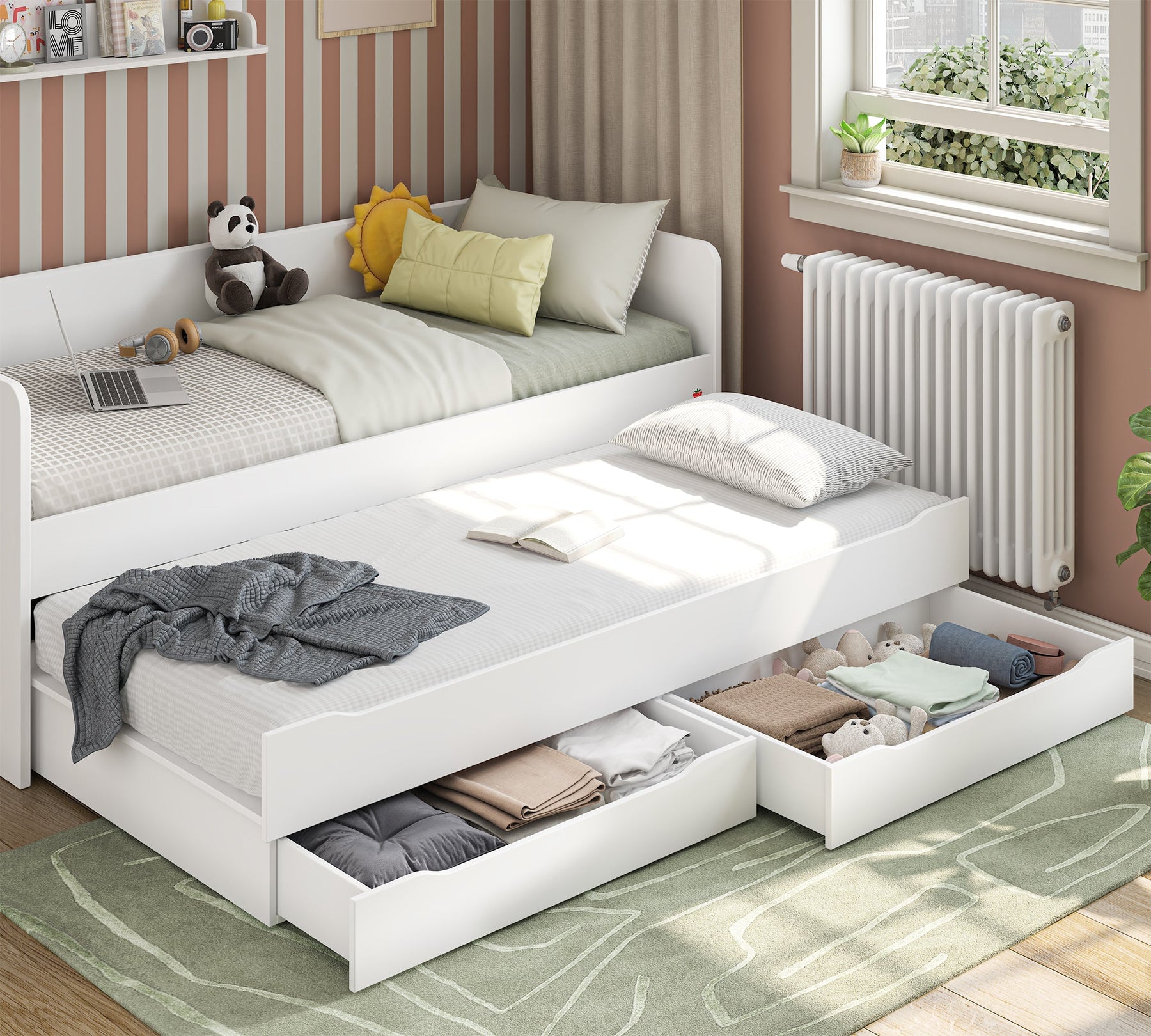 In addition to the upper and middle beds of the Studio series, the Drawer Bed Set can also be used as a guest bed and is extremely practical due to its wheeled design.