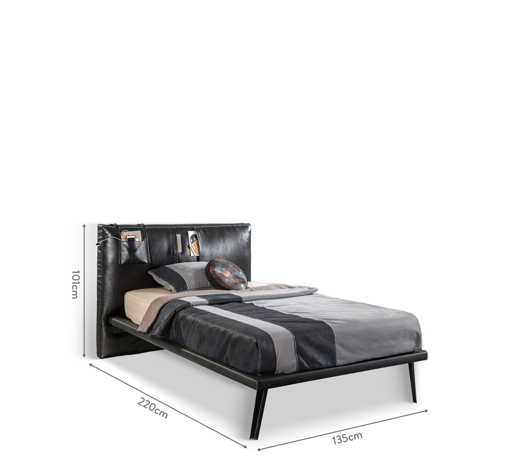 Dark Metal Bed, available in 100x200 cm and 120x200 cm sizes, adds a cozy touch to teen rooms with its eye-catching and comfortable headboard. Designed to complement other pieces from the Dark Metal collection, this model features a meticulously stitched, leather-covered headboard, including a handmade pocket for personal belongings.