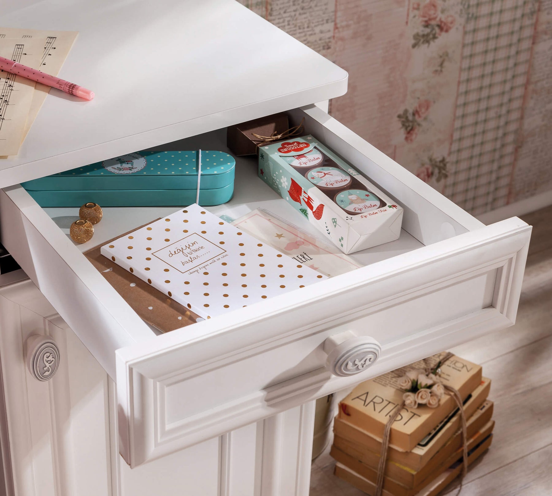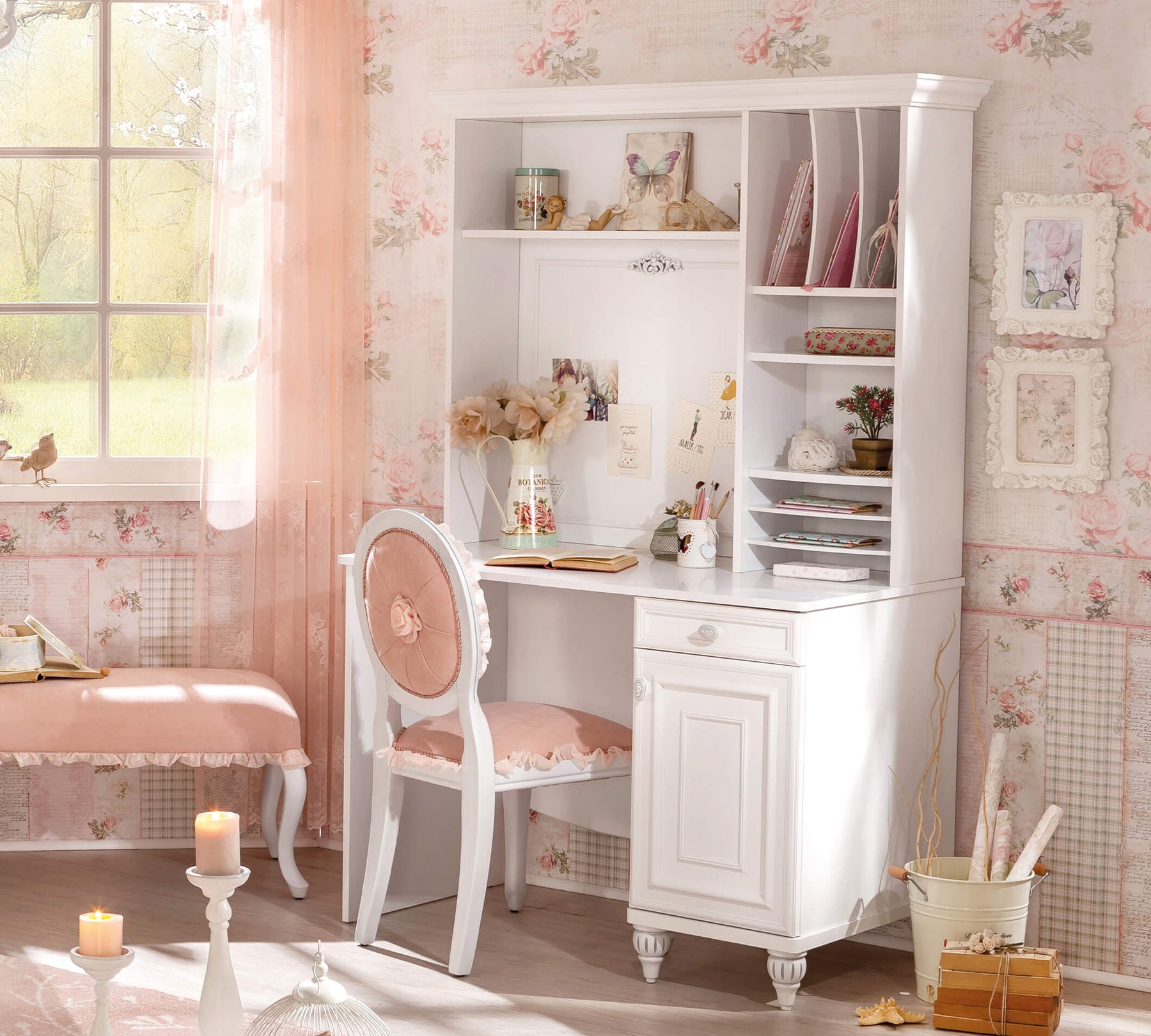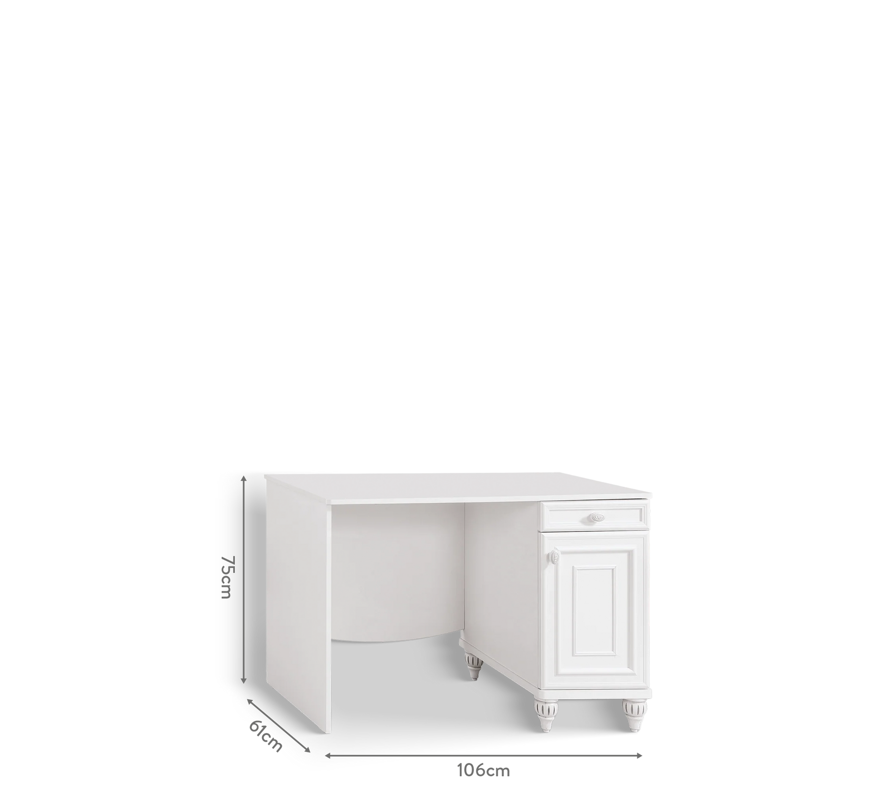 Стол Romantica белого цвета, простой и элегантный, поддерживает сказочный стиль серии. Стол с одним выдвижным ящиком и одной закрытой секцией предлагает детям эффективную и удобную рабочую среду.