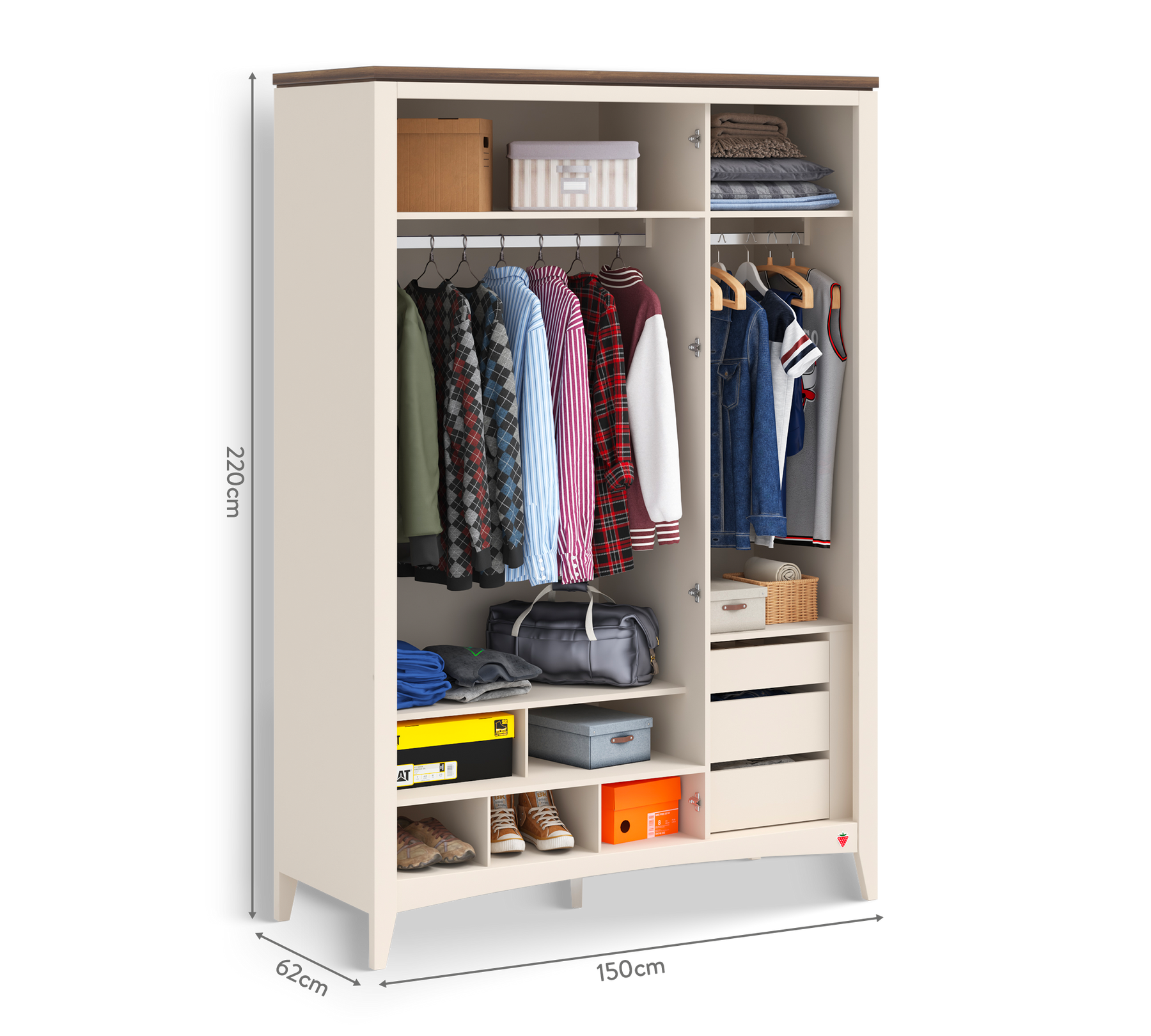 The wardrobe, which offers a spacious hanging area with two rectangular anodized clothing rails, features a structure reinforced with 2 mm thick edge banding on all edges that come into contact with hands, ensuring long-lasting use. Its metal feet, coated with electrostatic paint to resist oxidation and corrosion, maintain their durability for years.