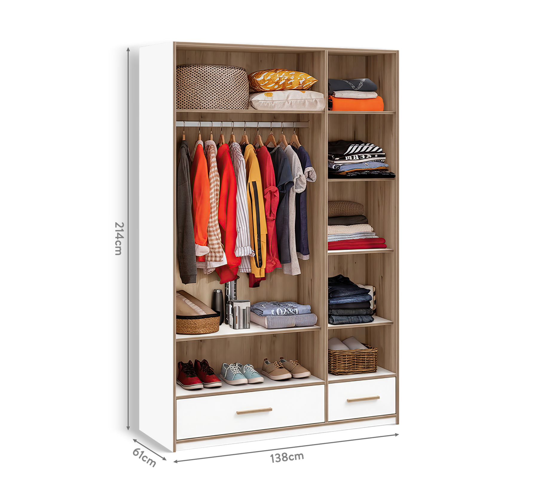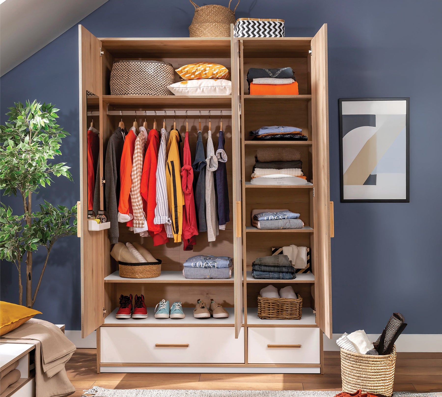 Деревянные ручки цвета бука и ореха, регулируемая система полок, широкий вешалка для одежды, вентиляционные капсулы, ящики с перегородками и спортивное зеркало внутри дверцы, а также отделение для личных вещей придают шкафу Модера 3-дверный стиль. Рекомендуется использовать монтажное крепление для стены, которое идет в комплекте, для большей безопасности при использовании.