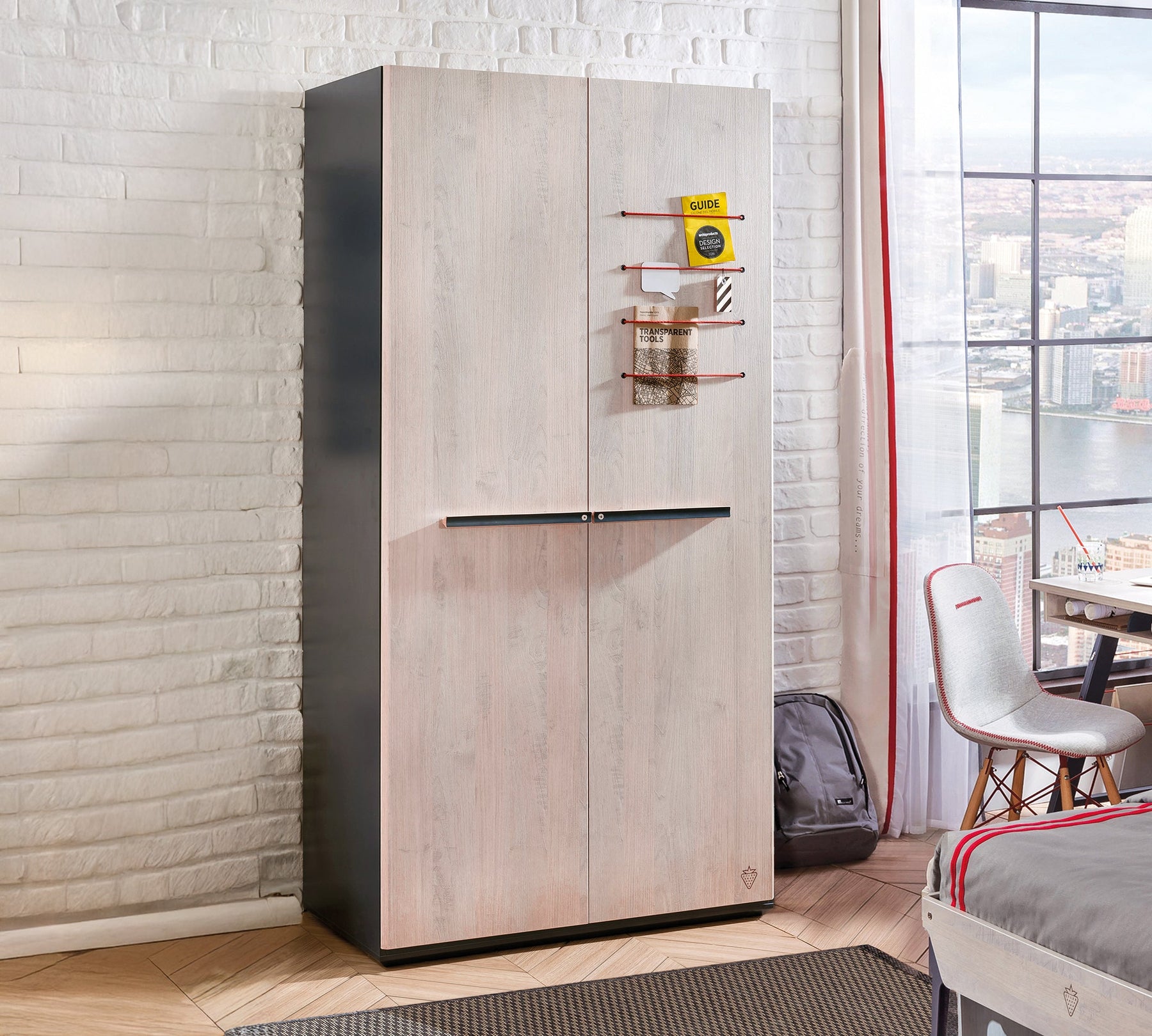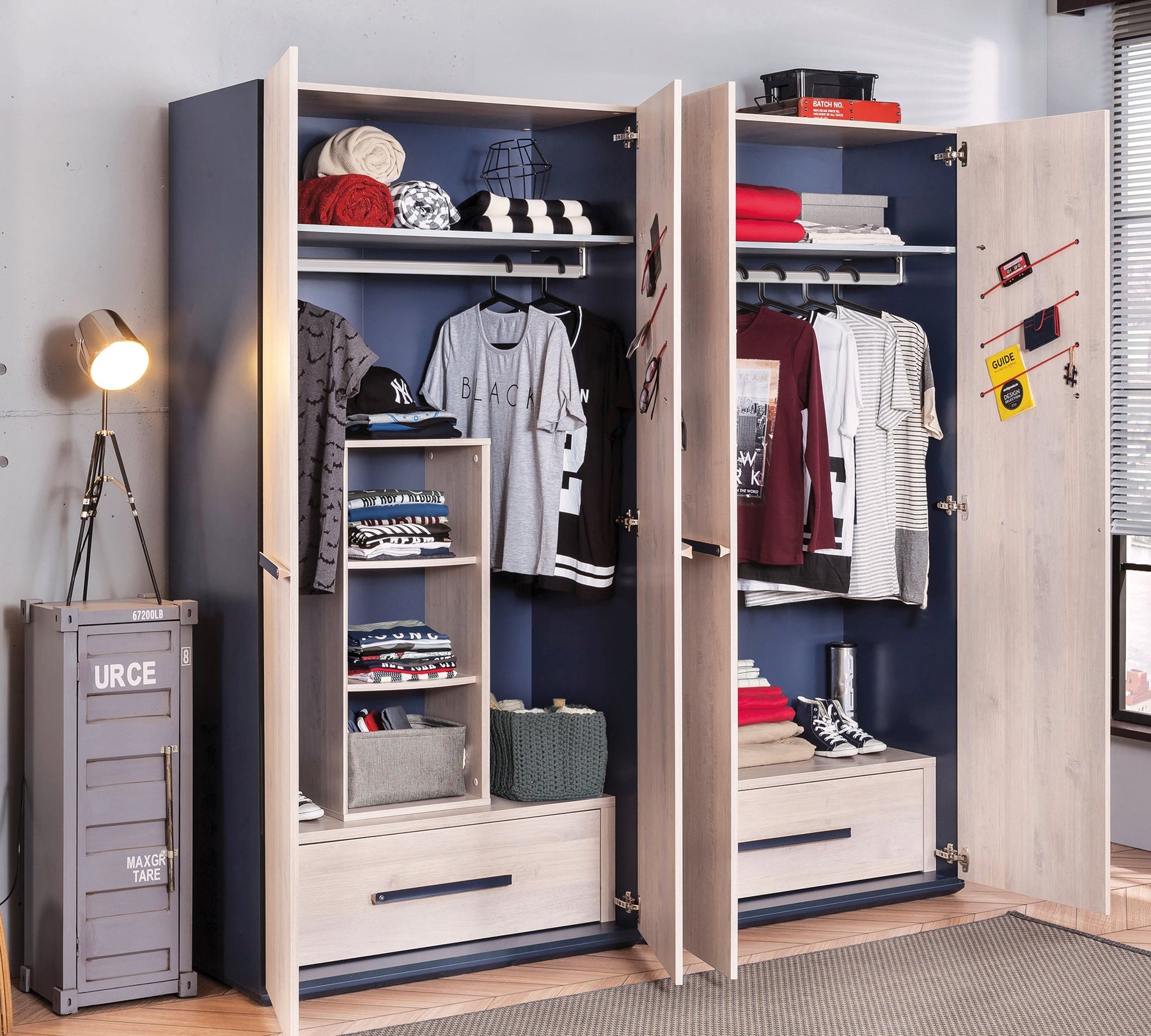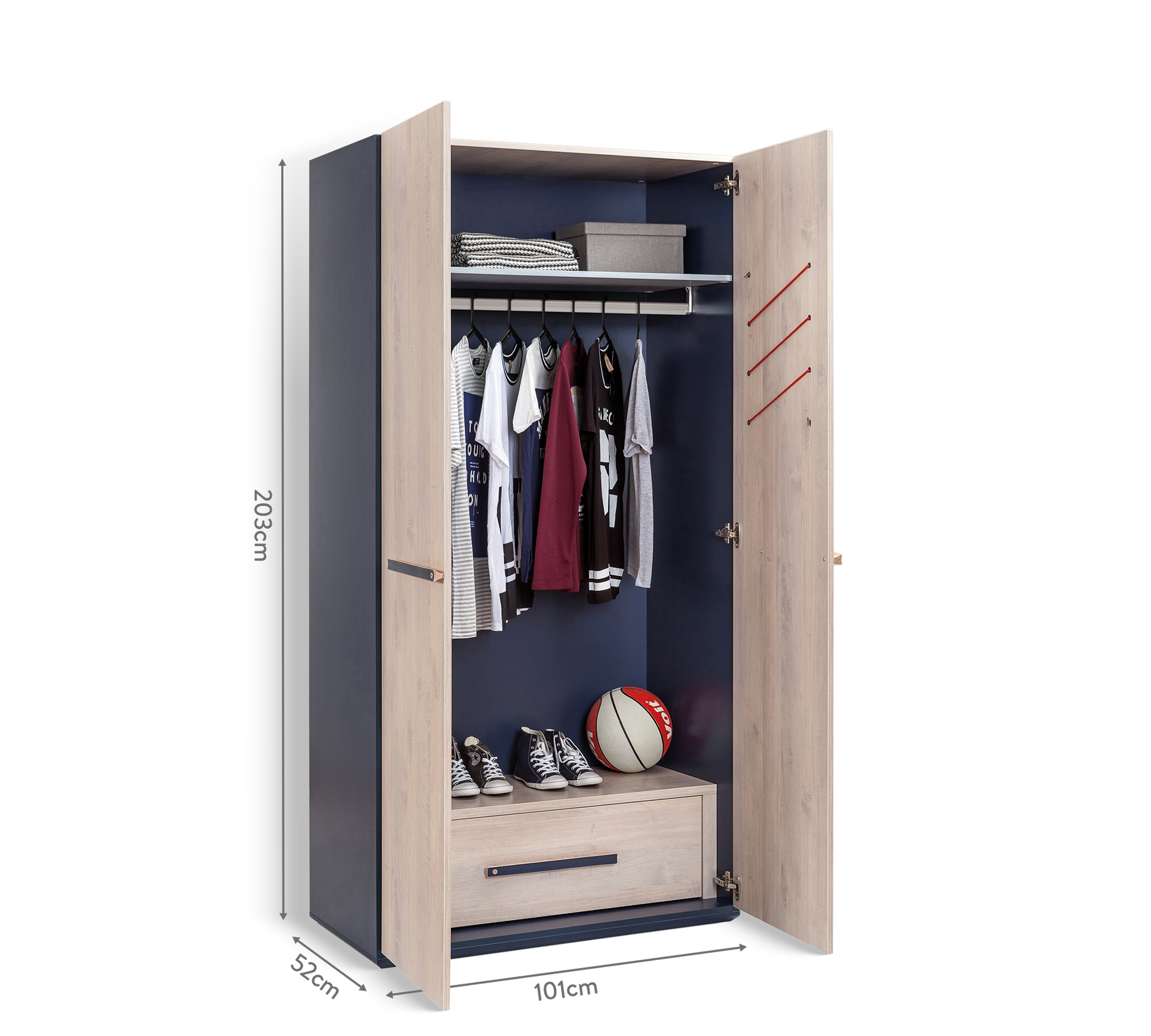 Двухдверный шкаф Trio помогает сделать комнату подростка более организованной и комфортной. Ящики и полки внутри шкафа обеспечивают идеальное место для хранения. Благодаря вентиляционным капсулам вещи вашего ребенка будут всегда иметь приятный запах, а функции системы плавного закрывания обеспечат тишину и безопасность. В комплет шкафа входит крепление к стене.