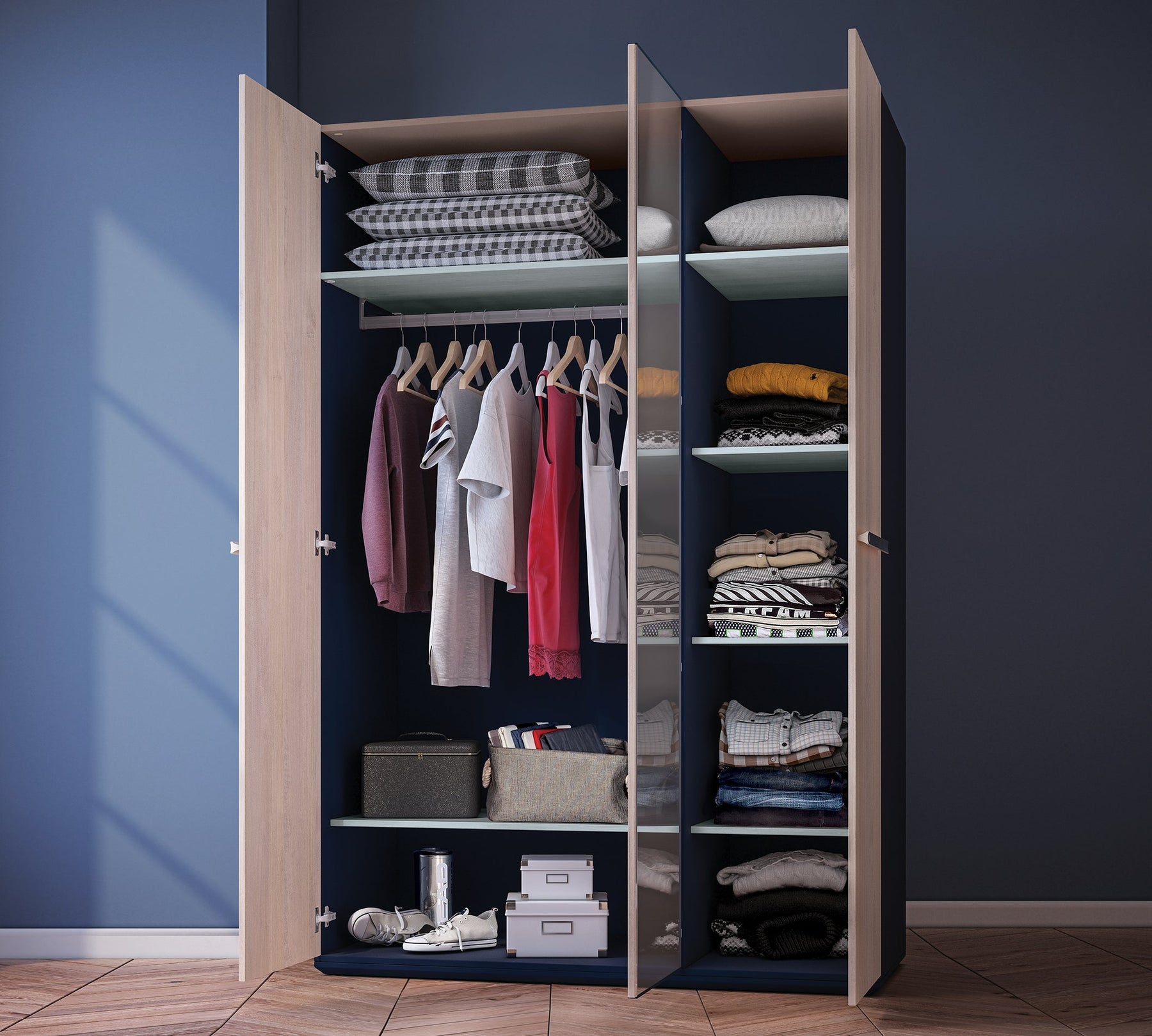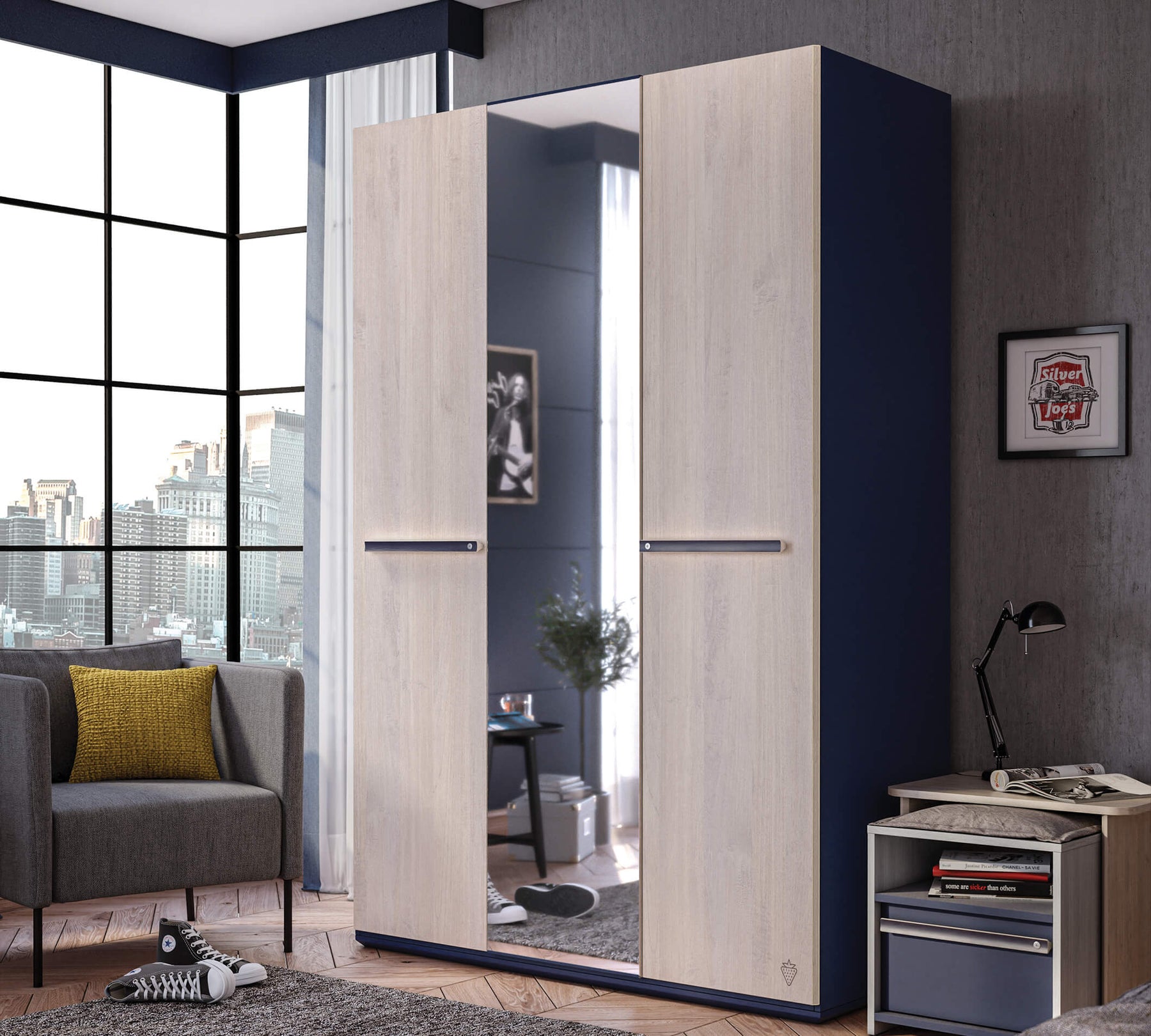 Трехдверный шкаф Trio благодаря объемной структуре , своим современным дизайном придает простор и элегантность жилому пространству подростков. Шкаф Trio используется в качестве отличного органайзера, имеет зеркало, защищенное металлическими держателями для безопасности при падении. Благодаря вентиляционной капсуле в шкафу не создается сырости а влаги. Двери шкафа можно бесшумно и легко закрывать с помощью системы доводчиков. В комплет шкафа входит крепление к стене.