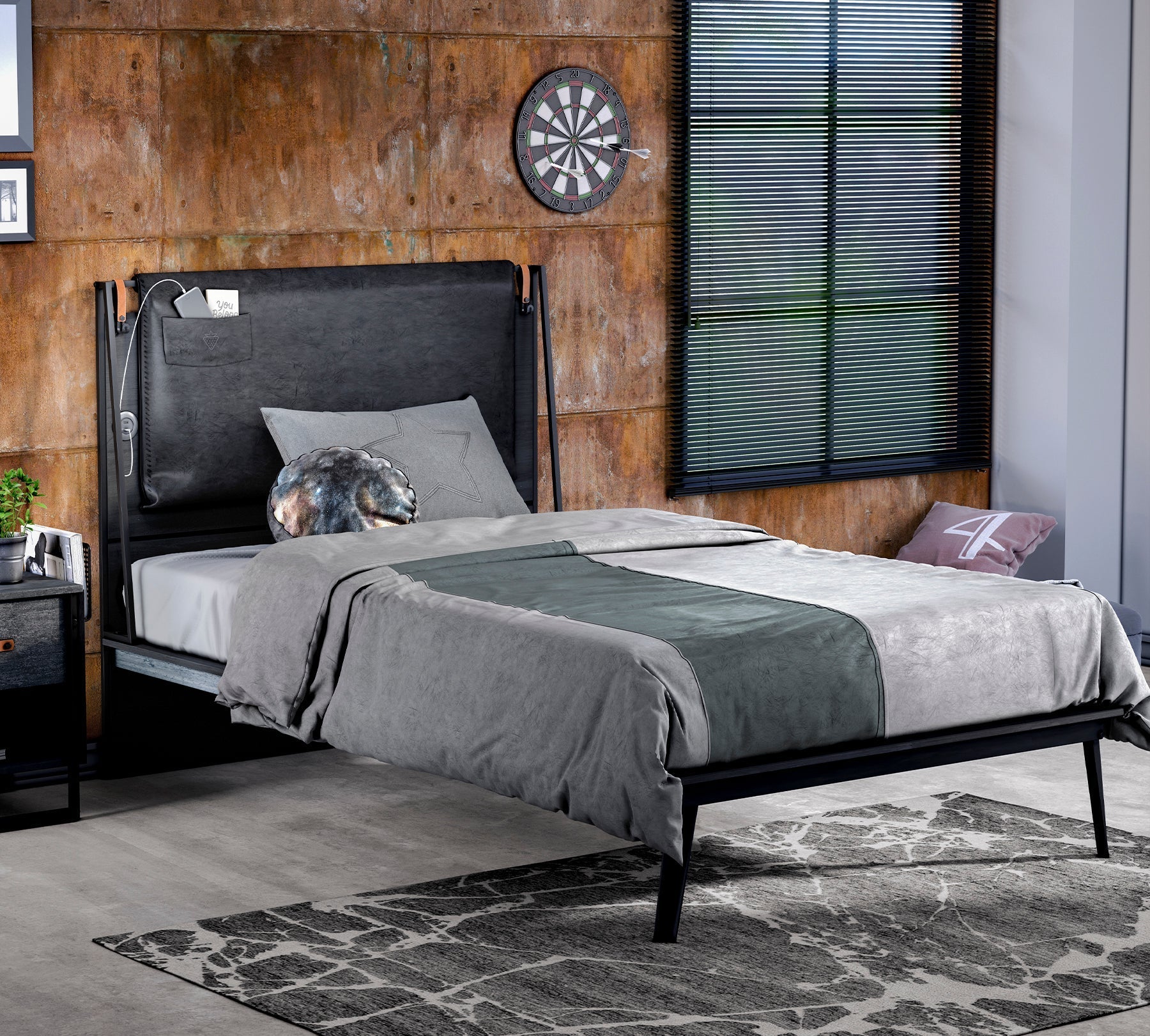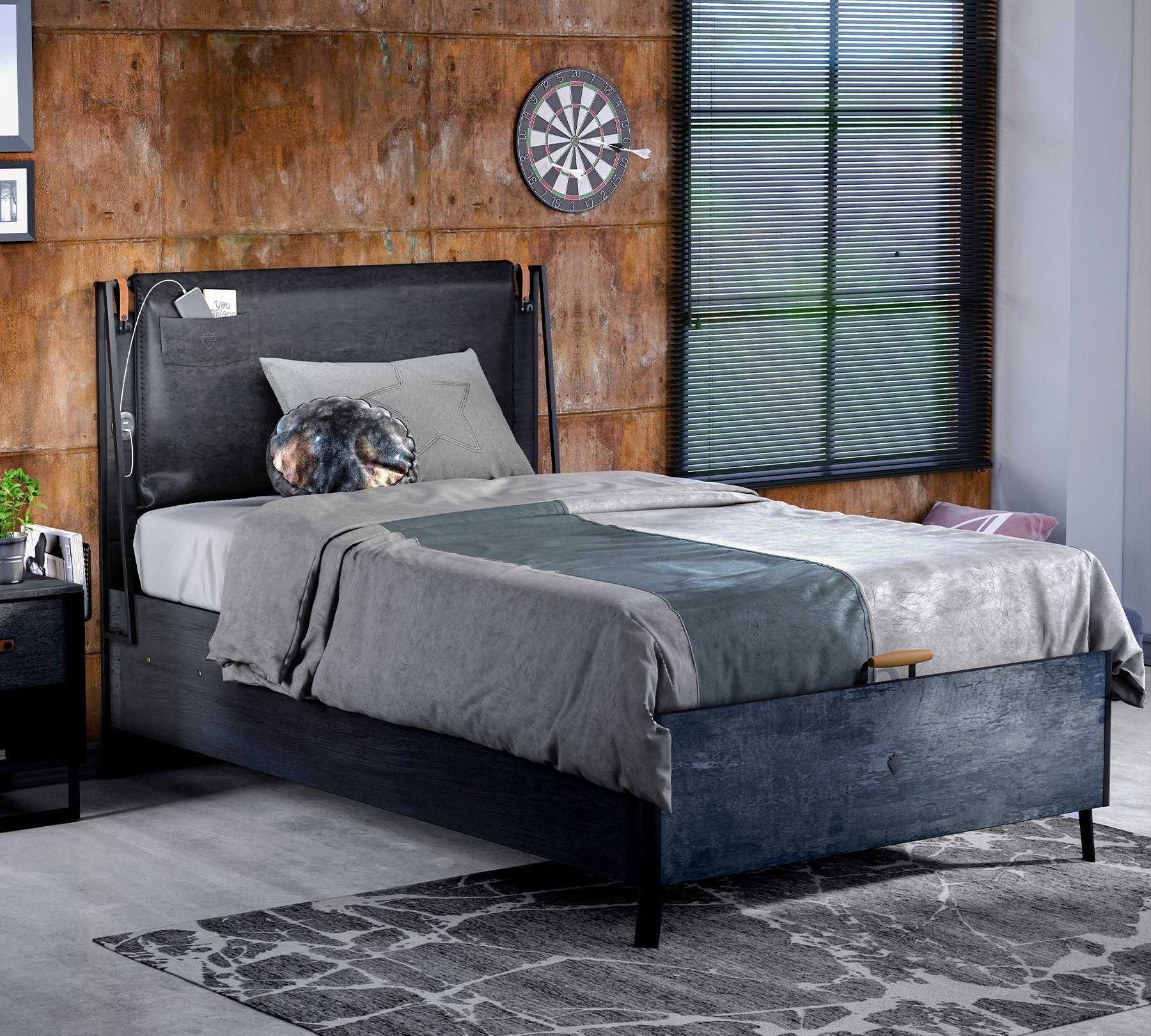 With its simple design and technologically functional headboard, the Dark Metal Line Head 120 cm brings a warm touch to teen rooms.