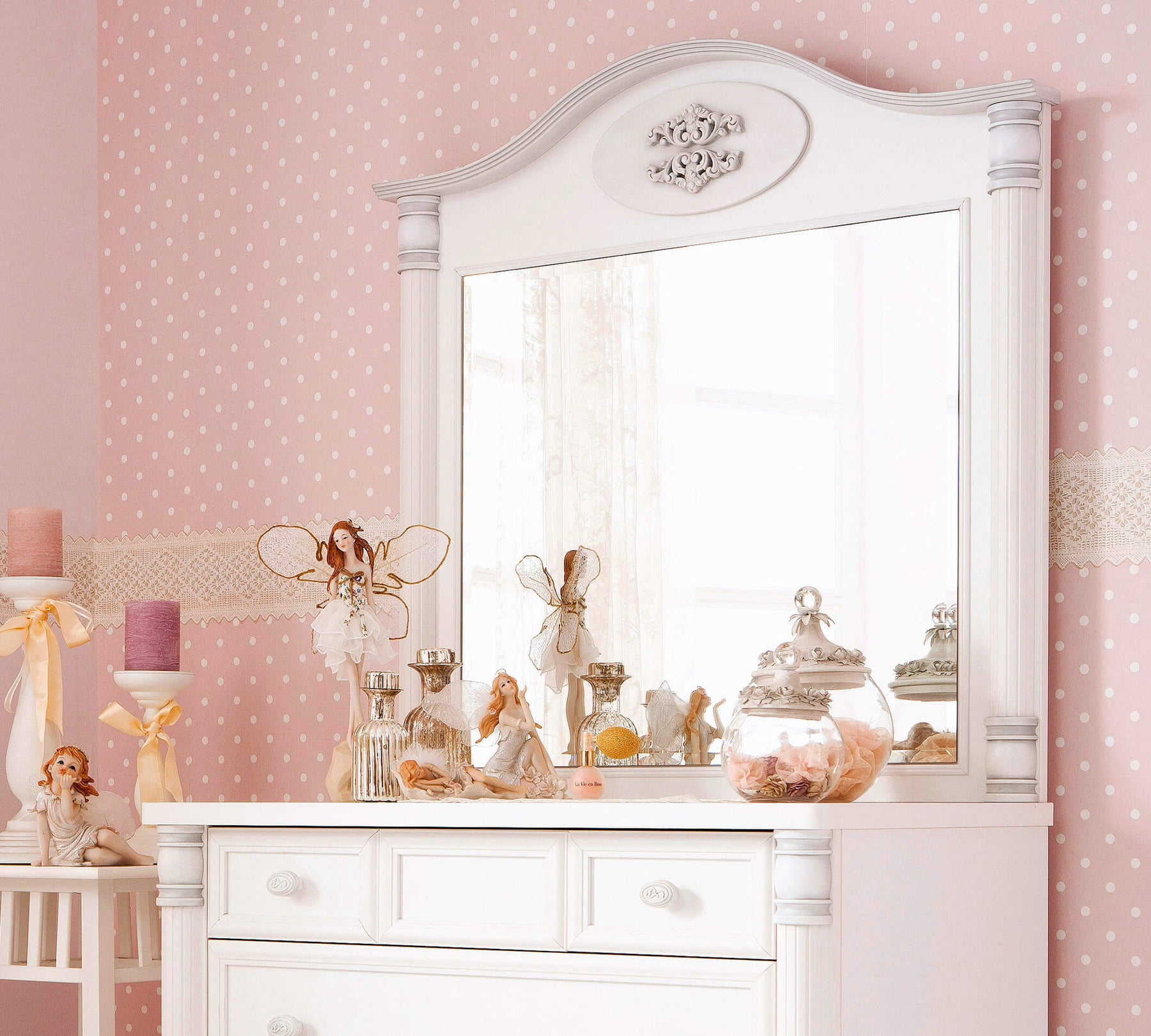 Зеркало к комоду Romantıc - один из самых элегантных предметов дополняющий комнату Romantıc, добавляет изысканность и утонченность пространству. Зеркало - это важный мебельный элемент в разитии вашей дочери, которая с раннего возраста поймет важность ухода за собой. Зеркало элегантного дизайна сочетается с комодами серии Romantıc.